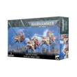 This multi-part plastic kit contains the components necessary to assemble a squad of 3 Vertus Praetors. Astride their Dawneagle jetbikes, they wear somewhat less bulky armour than the other Adeptus Custodes warriors, in order to maintain lightness – while they are still protected by auramite chest plates, shoulder pads and helmets, they wear woven trousers, boots and robes. The armour that they do wear is covered in finely sculpted sigils of the Emperor, with Imperial eagles, lightning bolts, gemstones and filigree adorning every surface, with the jetbikes they pilot featuring similar details on the aggressively-shaped cowling. The Praetors carry interceptor lances and misericordia, while the Dawneagle jetbikes are armed with a choice of hurricane bolters or salvo launcher – whichever you choose, they’re visible at the front of the vehicle, with the engine and weapon feeds visible in gaps in the cowling. The controls feature a large screen, with plenty of dials and buttons. The kit can also make a Shield-Captain, who is distinguished by his bare head.