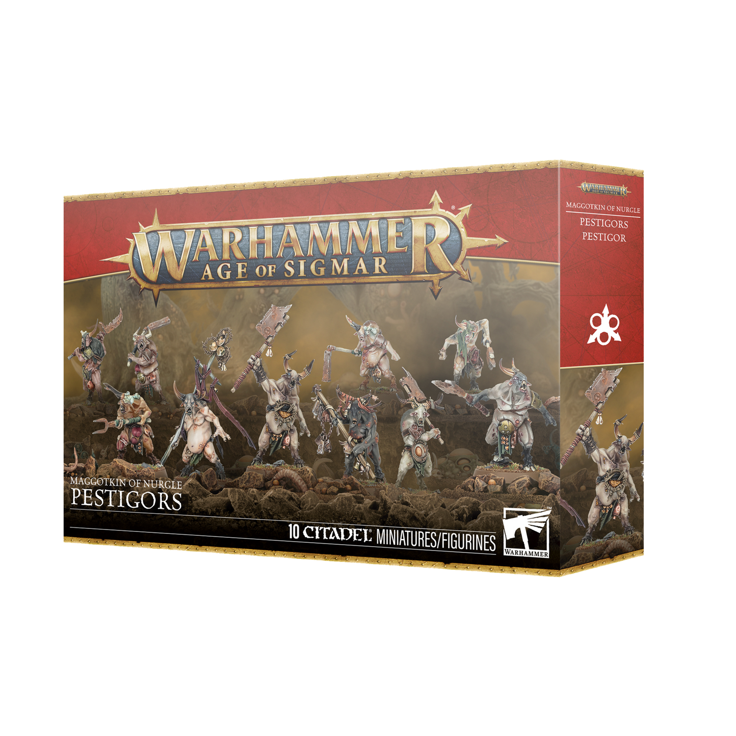 This multipart plastic kit builds 10 Pestigors for Maggotkin of Nurgle armies in Warhammer Age of Sigmar. Tough, bloated, and unnervingly resilient, Pestigors excel on the front lines—absorbing punishment while tearing into enemies with rusted, corroded weapons. The kit includes options for a champion, standard bearer, and musician, allowing for easy unit customization.