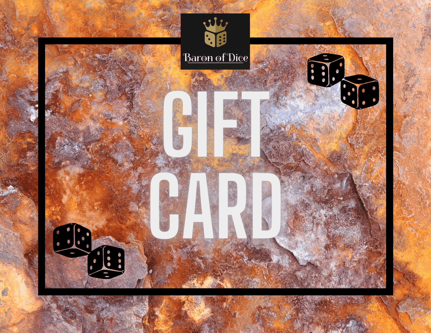 EntriesBaron of Dice Gift Card - $15.00 is backordered - Items typically arrive to our warehouse in 7-10 business days.