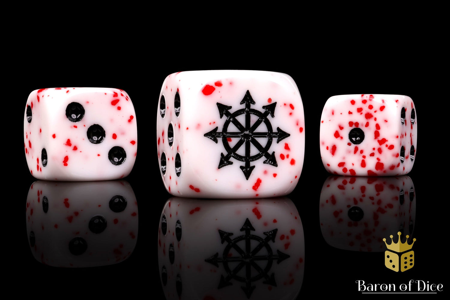 These contain a base of marble white covered in sprayed blood speckles and inlaid in a pure black; resin 16mm dice. The symbols are on the 6 side. These dice have an option of round or square corner; choose wisely! Our premium dice now come in a unique reusable tin.