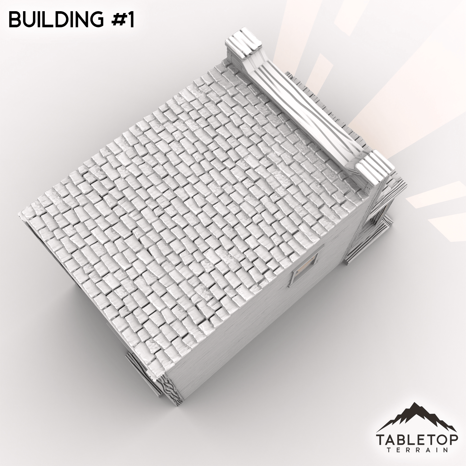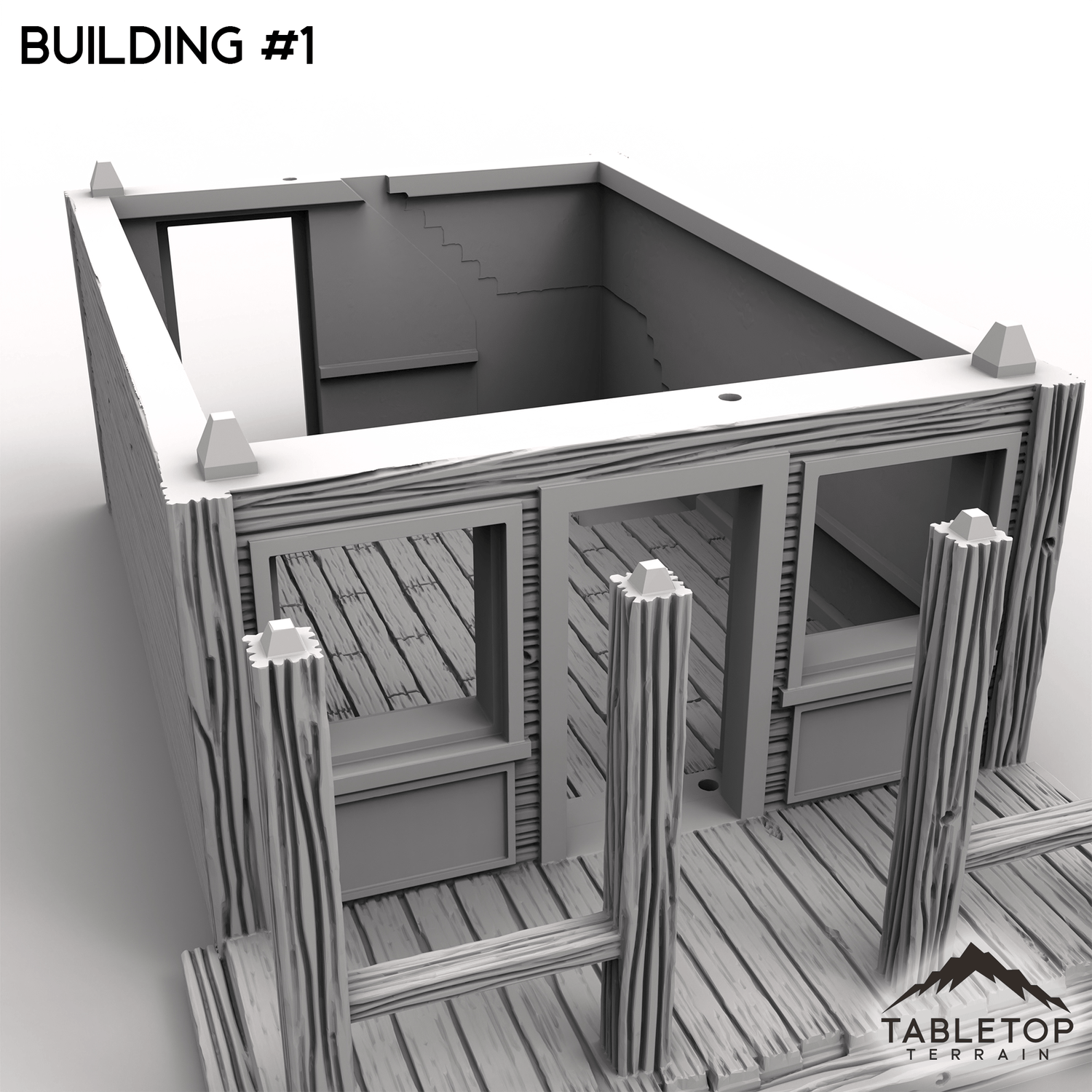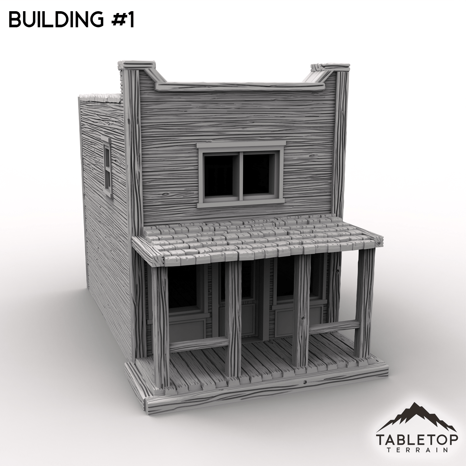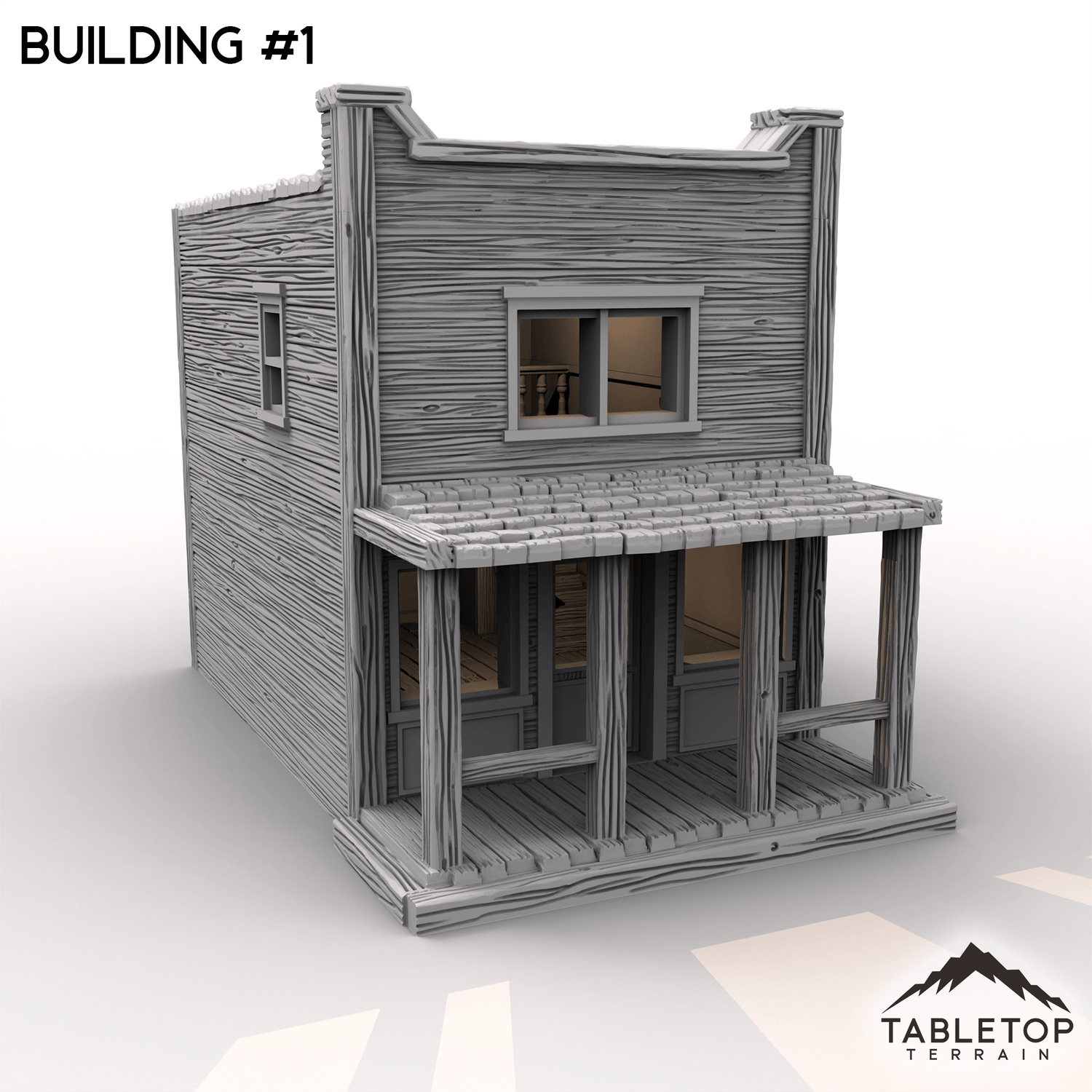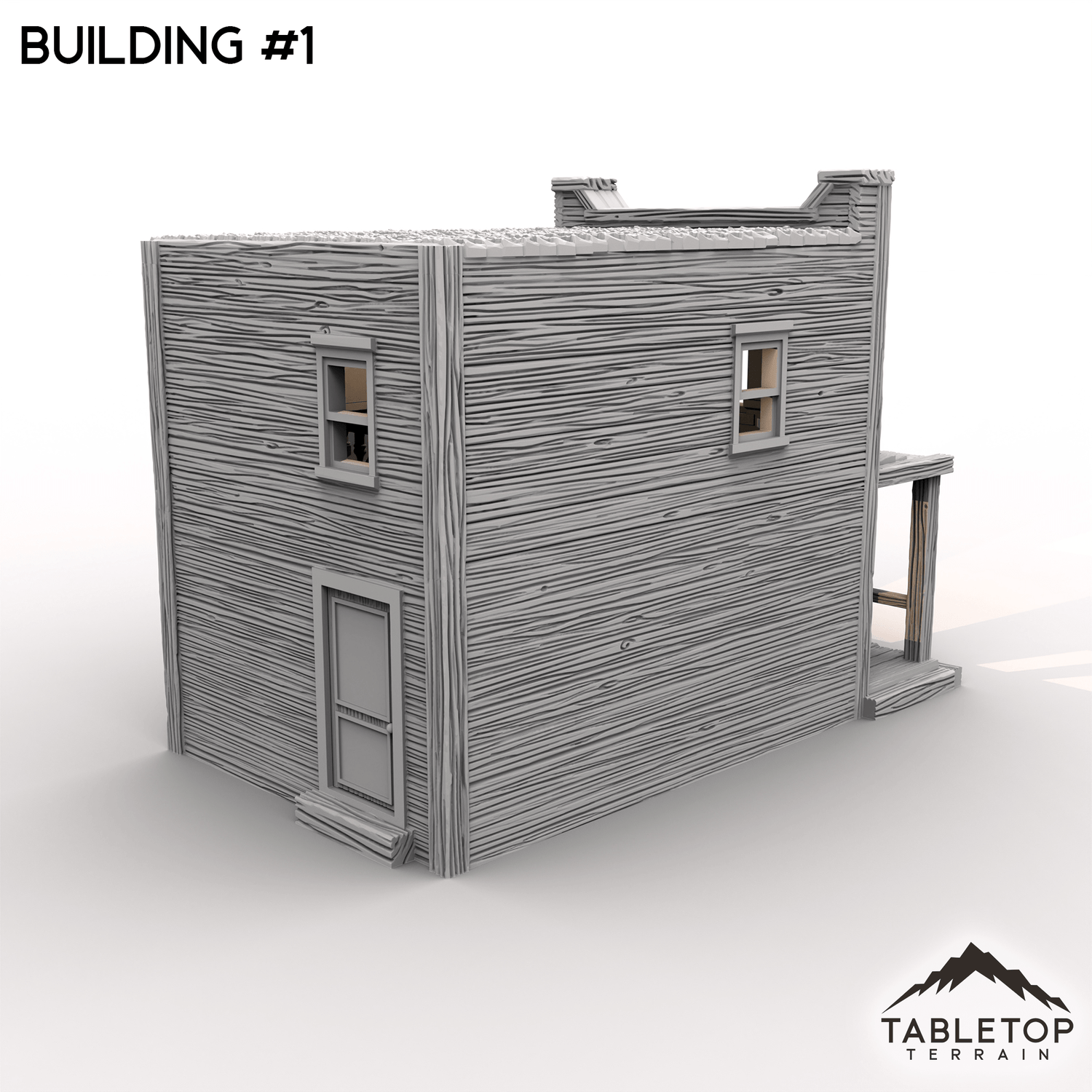 Dreadwood Building 1 is a 2-story building featuring a small front porch with a simple covering above. The town of Dreadwood features a wide range of highly functional buildings for making your own Wild West style town. Each building from Deadwood is made to be easy to paint, have working doors and open windows, designed to look good from the inside and out.