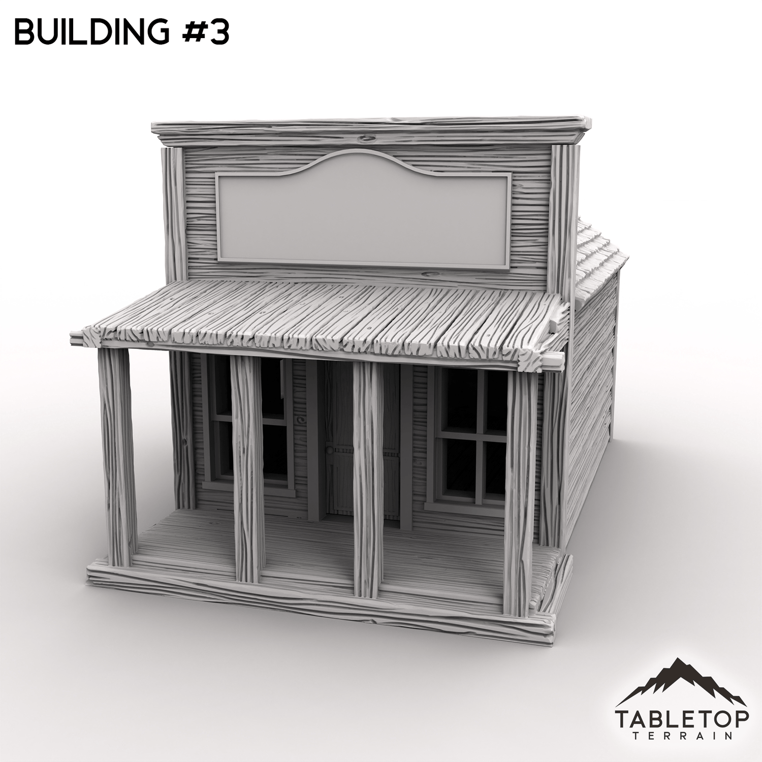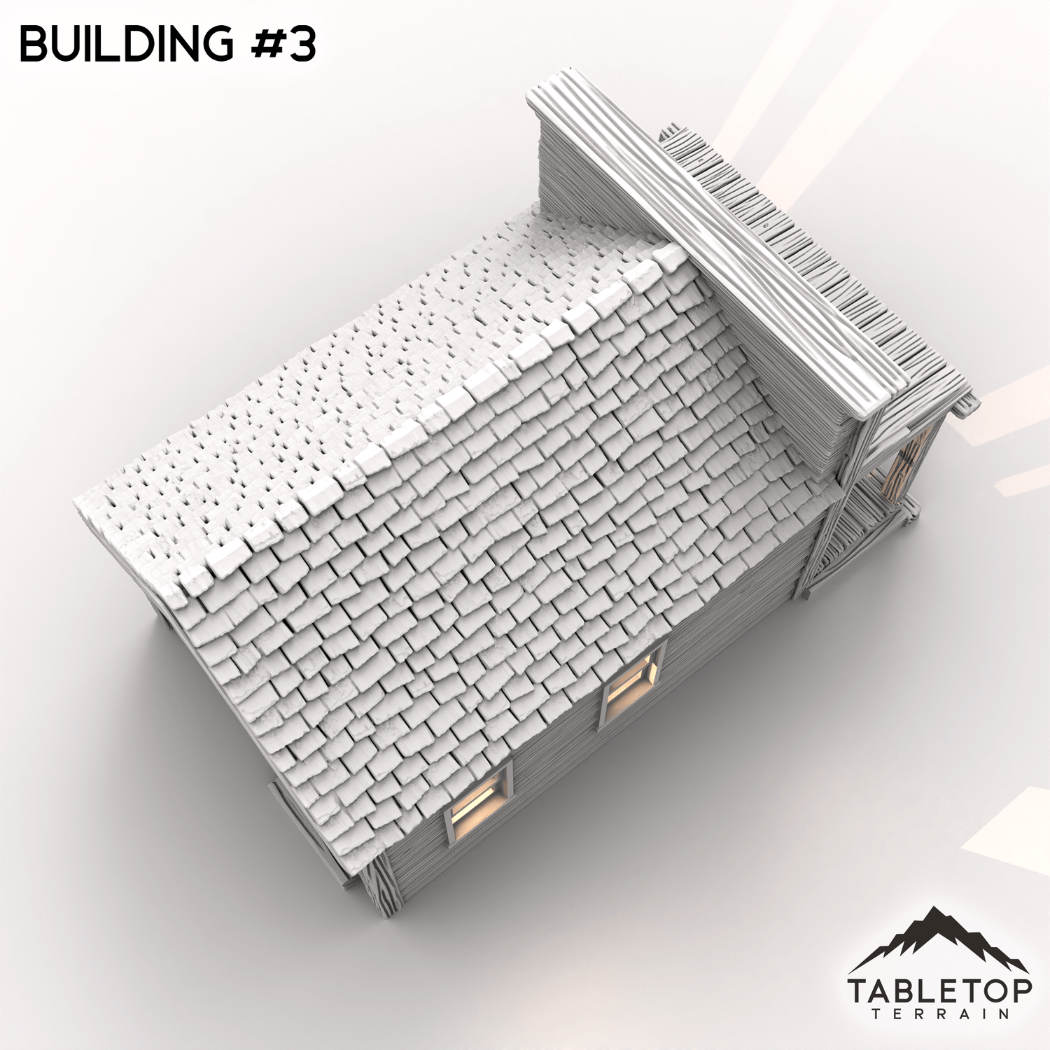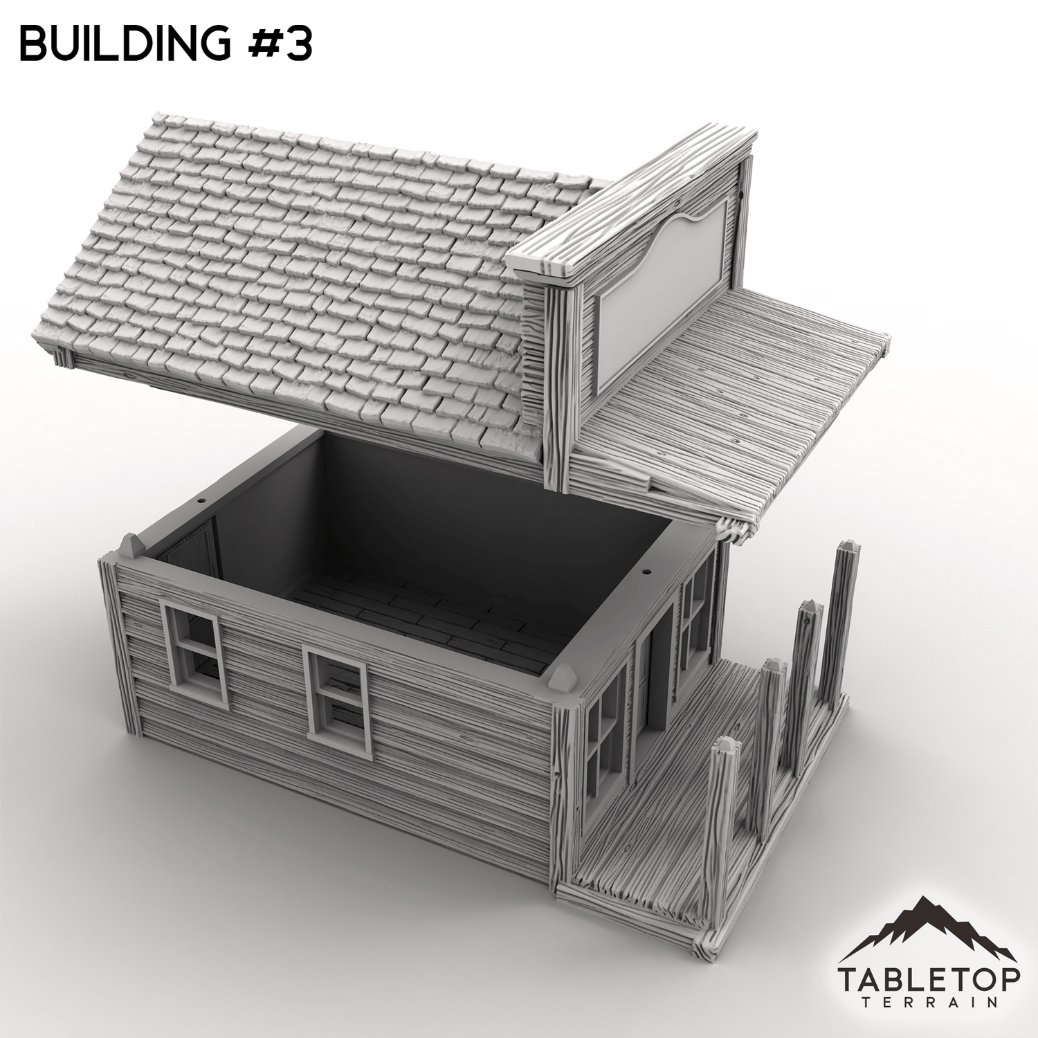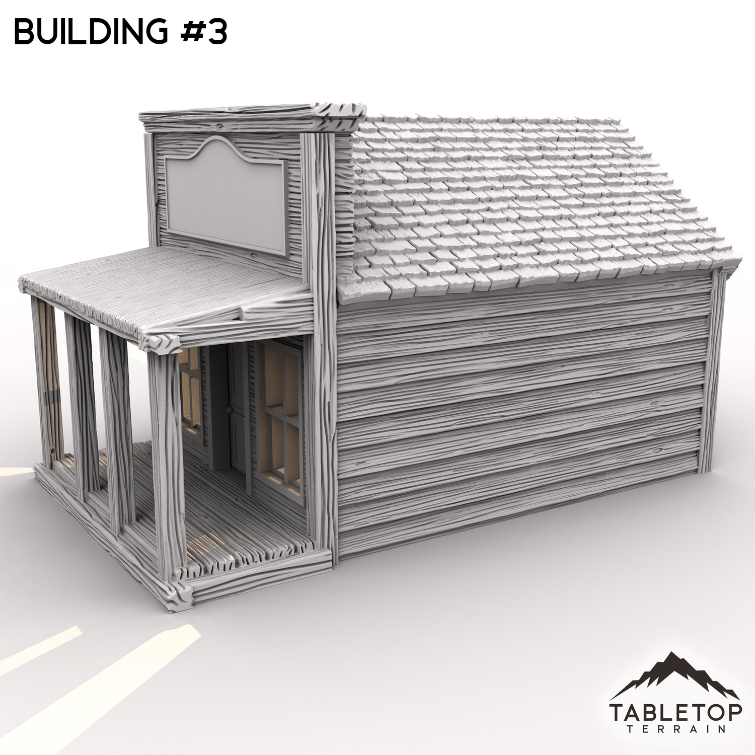 Dreadwood Building 3 is a single-story building featuring an empty spot for a sign and a sharply-angled roof. The town of Dreadwood features a wide range of highly functional buildings for making your own Wild West style town. Each building from Deadwood is made to be easy to paint, have working doors and open windows, designed to look good from the inside and out.