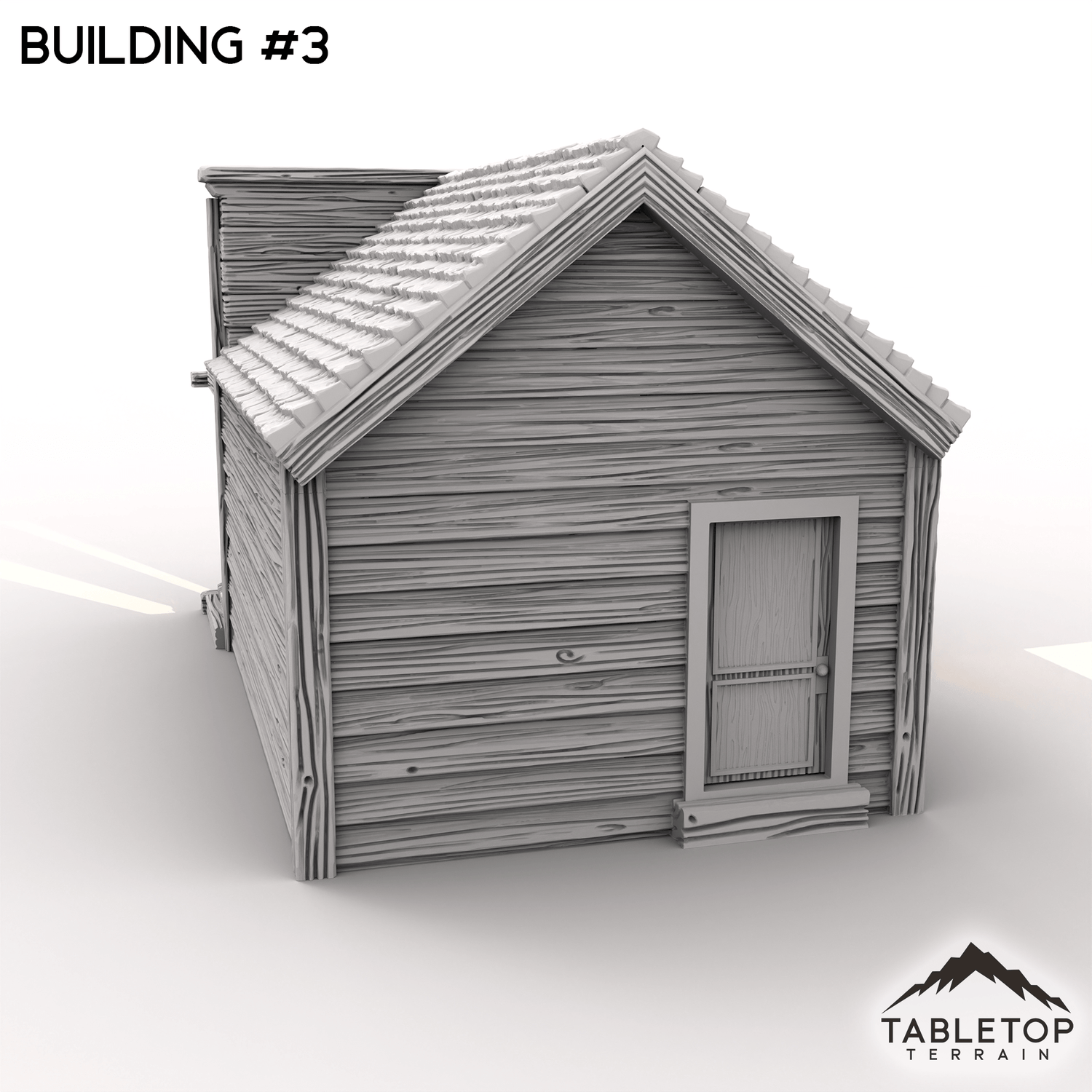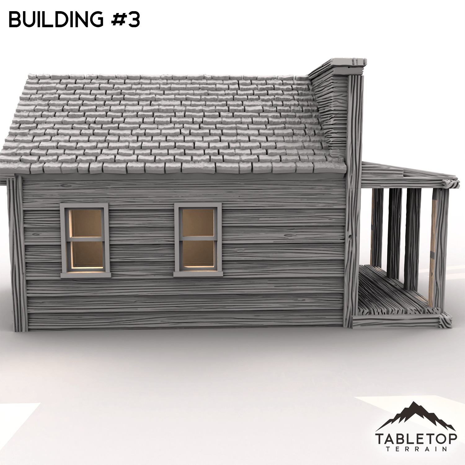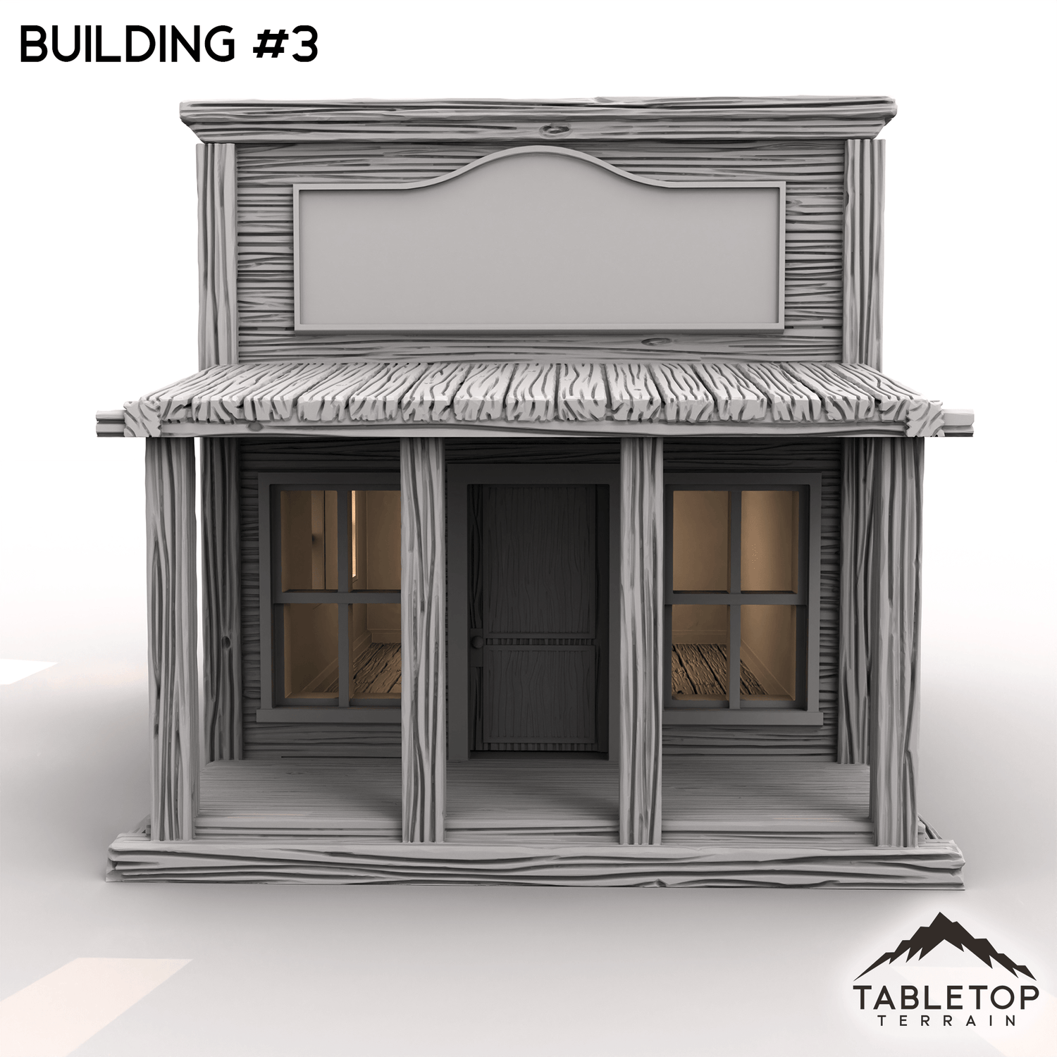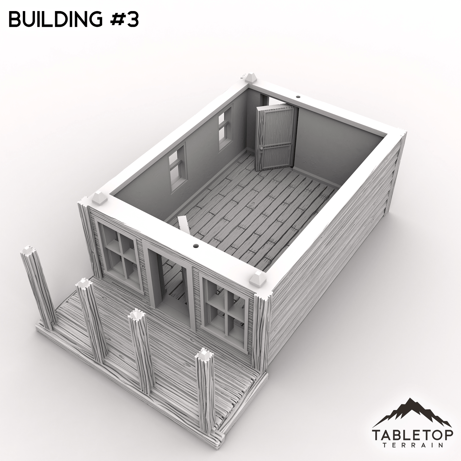 Dreadwood Building 3 is a single-story building featuring an empty spot for a sign and a sharply-angled roof. The town of Dreadwood features a wide range of highly functional buildings for making your own Wild West style town. Each building from Deadwood is made to be easy to paint, have working doors and open windows, designed to look good from the inside and out.