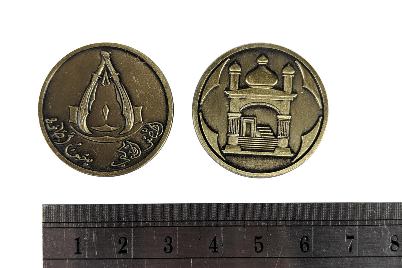 The Assassins Guild Gold coins are circle shaped and have an antique gold finish.