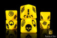 These contain a mix of pale yellows swirled with vivid yellows and inlaid with a void black. The symbols are all unique with a focus on a singular critical die face. Each set comes with x10 D8 dice encased inside an exclusive metal tin.
