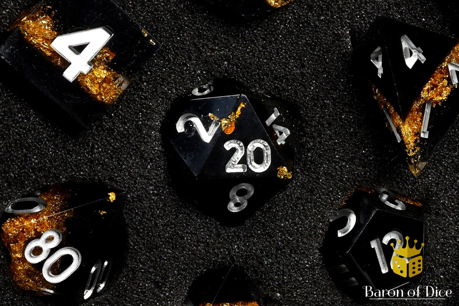 This set replicates hazard markings, containing golden powder veins, experience royalty in your hands! The dice are hand polished sharp corners, unique amongst our collection. Featuring a pure black translucent swirled with a single vein of golden powder and inlaid with a metallic silver; premium hand-mixed resin 16mm dice set containing D4, D6, D8, D10, D10, D12, and D20.