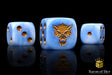 These contain a mix of icy whites swirled with frozen blues and inlaid with a metallic bronze; resin 16mm dice. The symbols are on the 6 side. Our premium dice come in unique reusable tins.