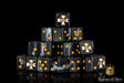 Featuring a base of deadly black swirled with veins of ferrous silver and featuring a two-toned honorable white and metallic gold inlay; resin 16mm dice. The symbols are on the 6 side.