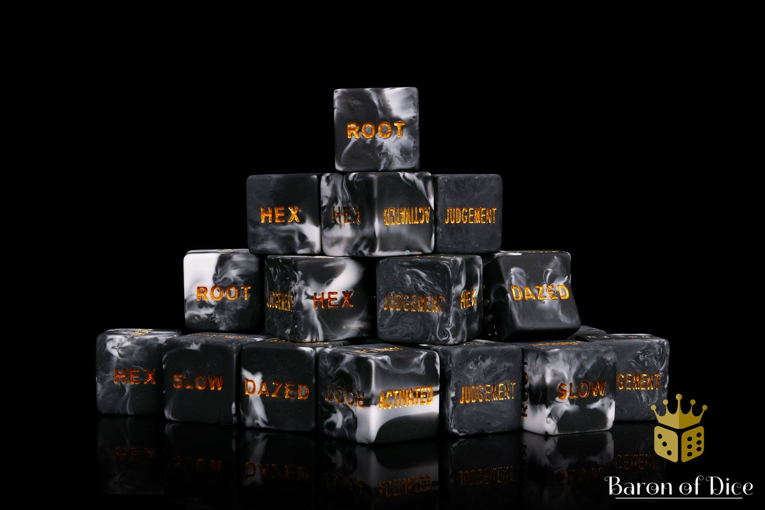 Are you tired of boring old keyword counters? Are your token-filled decks busting at the seams with outdated single keyword tokens? Time to put these matte black marbled counters on your favorite cards and tokens! Each set contains x6 unique keyword dice and x6 additional keyword dice. Our set of x12 keyword dice come inside a unique reusable metal tin.