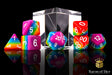 This set is created to resemble a pastel infusion rainbow.  The dice are a seven layer, hand poured, cascading colors of the rainbow and inlaid with a crisp white; premium hand-mixed resin 16mm dice set containing D4, D6, D8, D10, D10, D12, and D20.