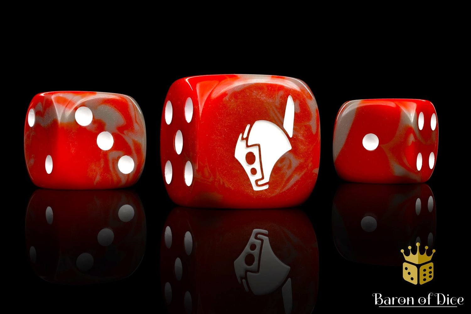 These contain a mix of fierce reds swirled with a machine greys and inlaid in the purest white; resin 16mm dice. The symbols are on the 6 side. These dice come in round corner or square corner; choose wisely! Our premium dice now come in a unique reusable tin.