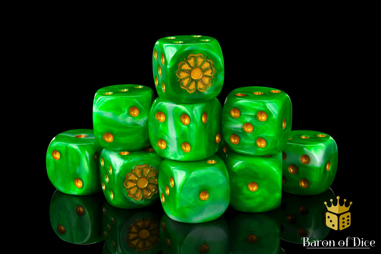 These contain a mix of virtuous greens swirled with a noble white and inlaid with a metallic gold; resin 16mm dice. The symbols are on the 6 side. Our premium dice come in unique reusable tins when purchased in x25 and x50 counts.
