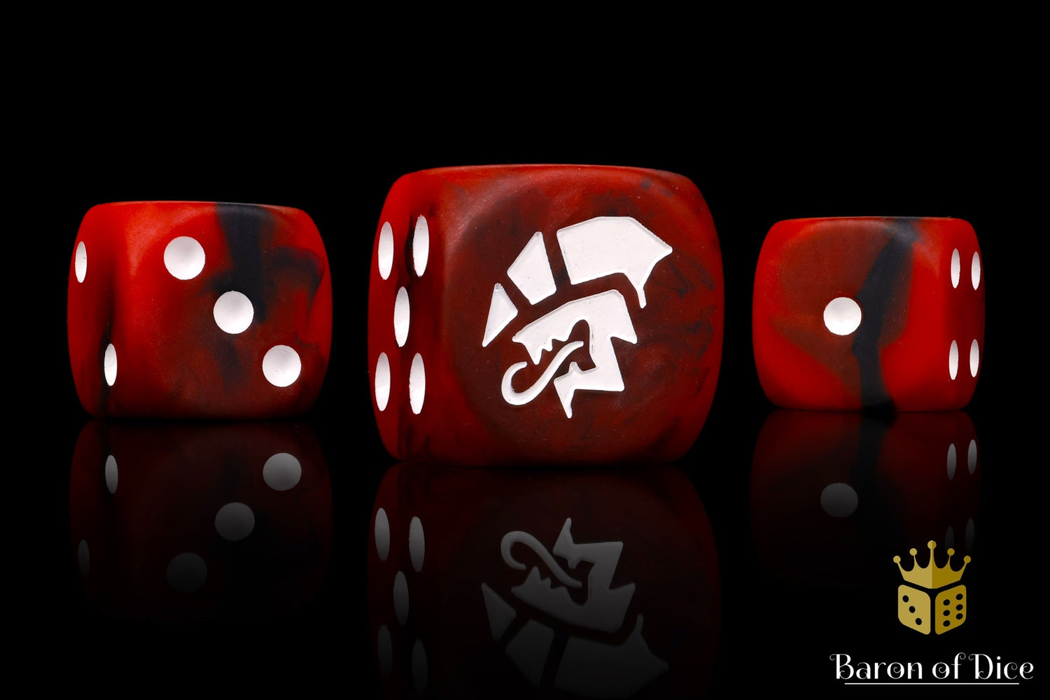 The Fleet approaches... These contain a base of bloodied reds with veins of warp blacks extruding and inlaid with a crisp white; resin 16mm dice. The symbols are on the 6 side. These dice have an option of round corner, square corner or 12mm mini; choose wisely! Our premium dice now come in a unique reusable tin! All dice are Matte finish!