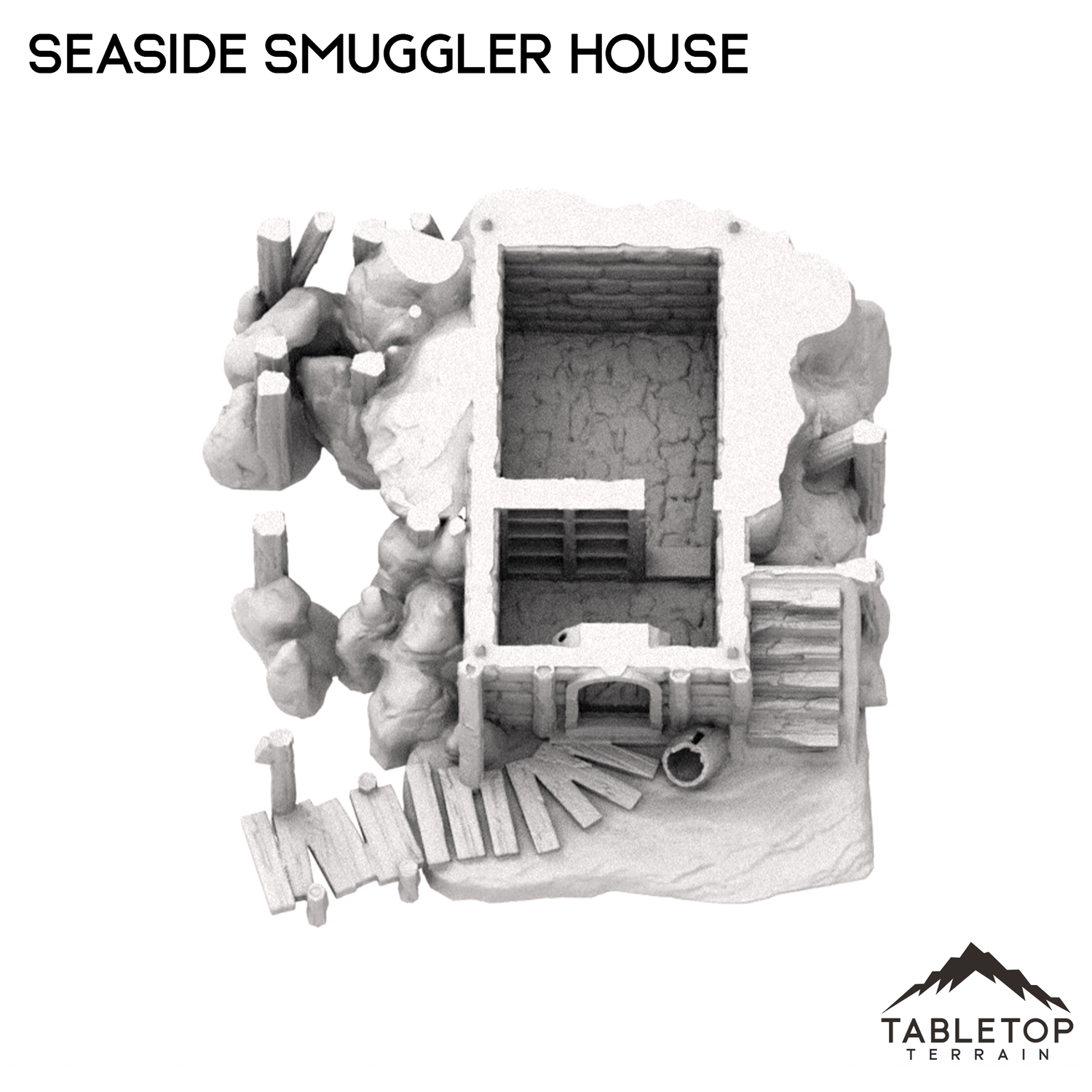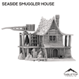 The Seaside Smuggler House is a two-story house with an attached pier and cargo crane. Each level of the house is removable and the crane can articulate on the mount. It also includes a small scatter set with boxes, barrels, goods, and a ruined boat. Miniatures can be placed inside and it is available in 32mm, 28mm, 20mm, and 15mm scales.