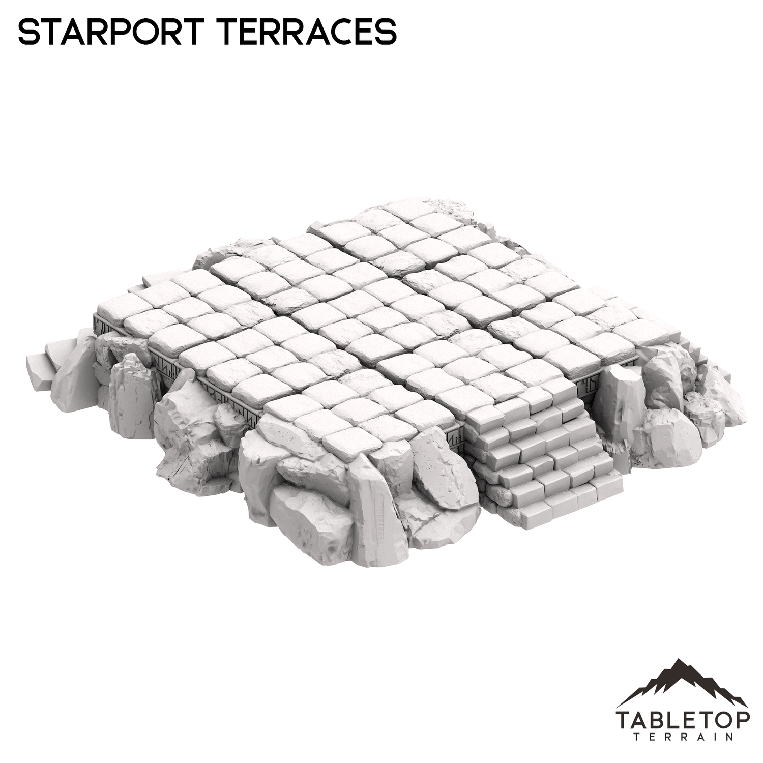 The Starport Terraces set includes 9 terraces that can be used to add elevation to your Ancient Starport tables. There are 4 different corner modules, 4 different side modules and one internal module, all designed to sit flush next to each other (or being stacked upon each other). They are the answer to a truly ancient wargaming conundrum: how do you add hills to a urban table setup?