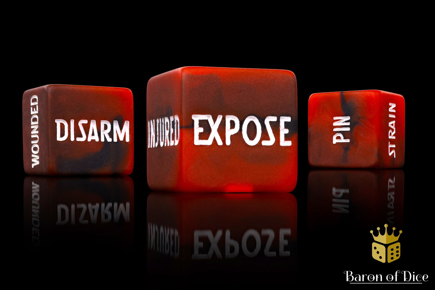 In the galactic war, raging through centuries, war is determined by skirmishes... ready your forces for the skirmish of a lifetime! Are you ready to make gameplay more fun? This set of premium hand-mixed resin dice feature unique symbols on all sides outlaying the 6 main status effects during a Galactic Skirmish game, simply place the die next to the model that is "Pinned" or "wounded", that's it! 6 tokens in one single die!
