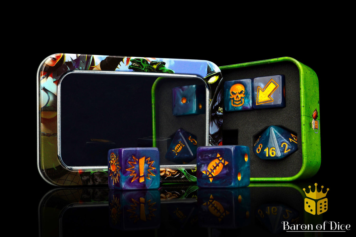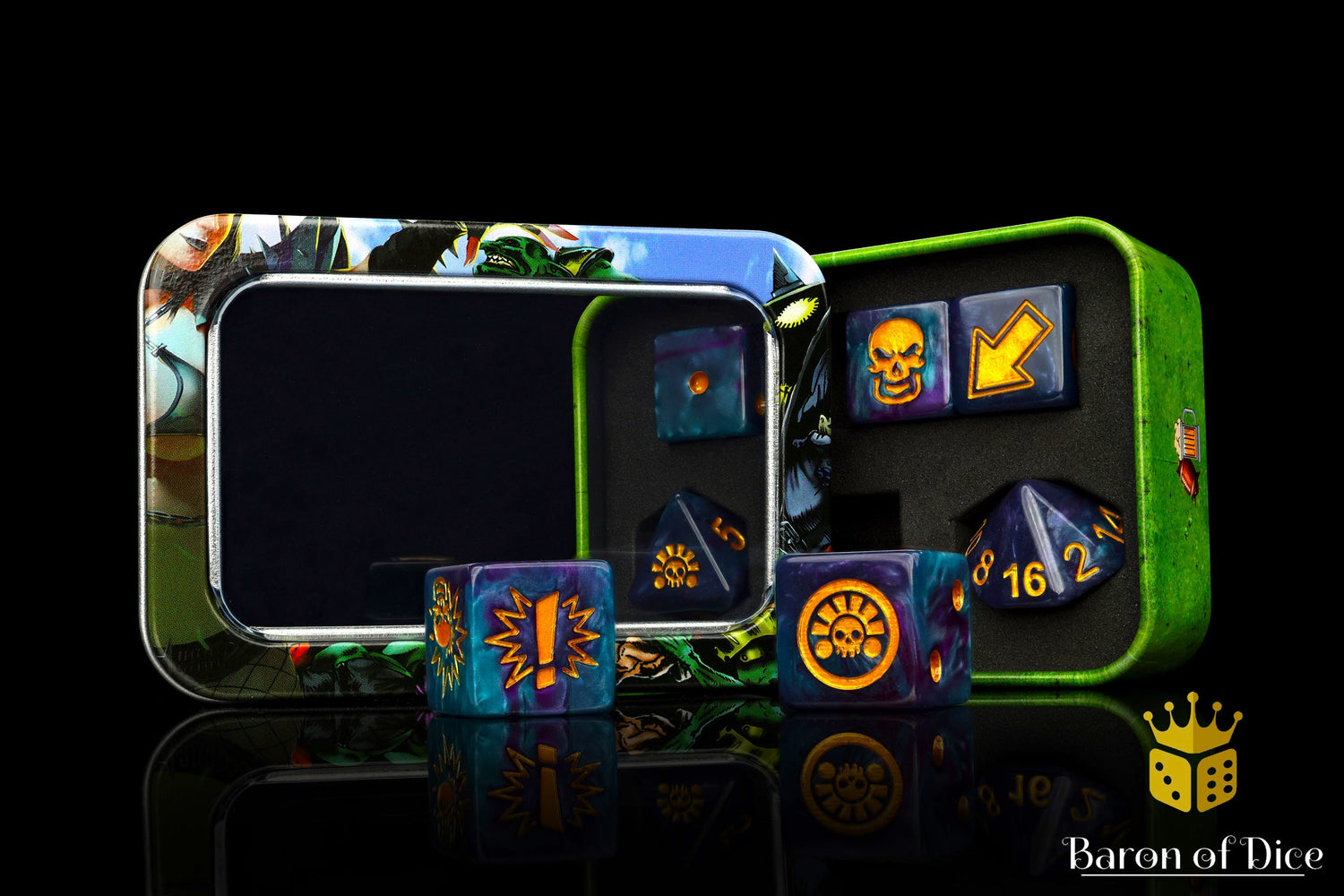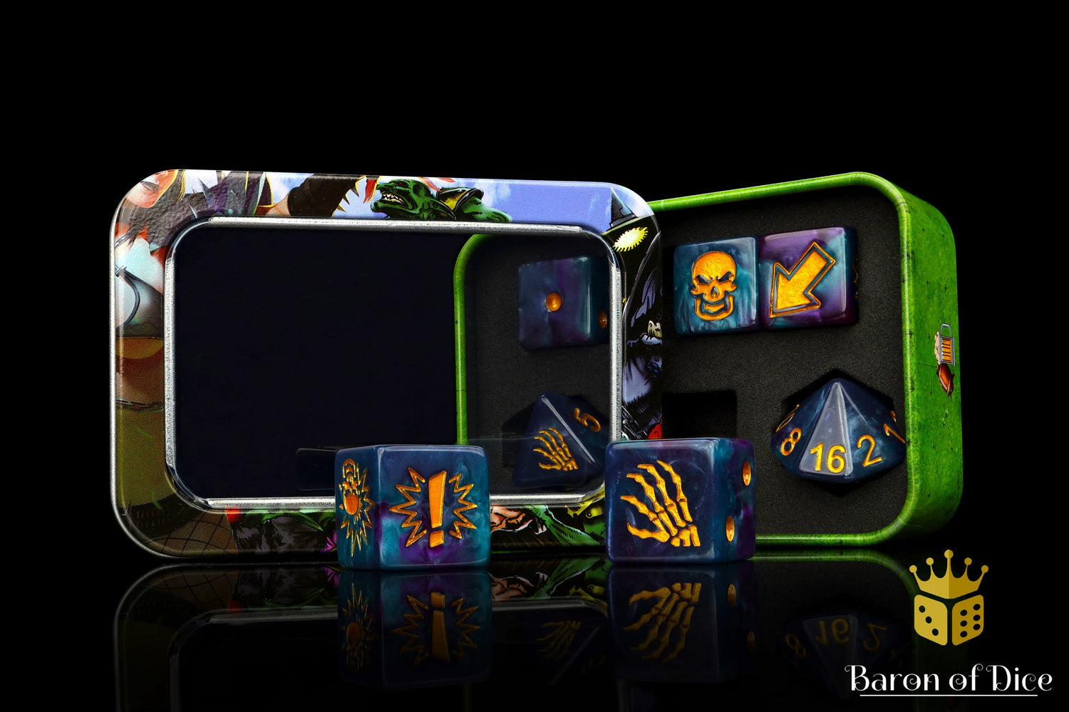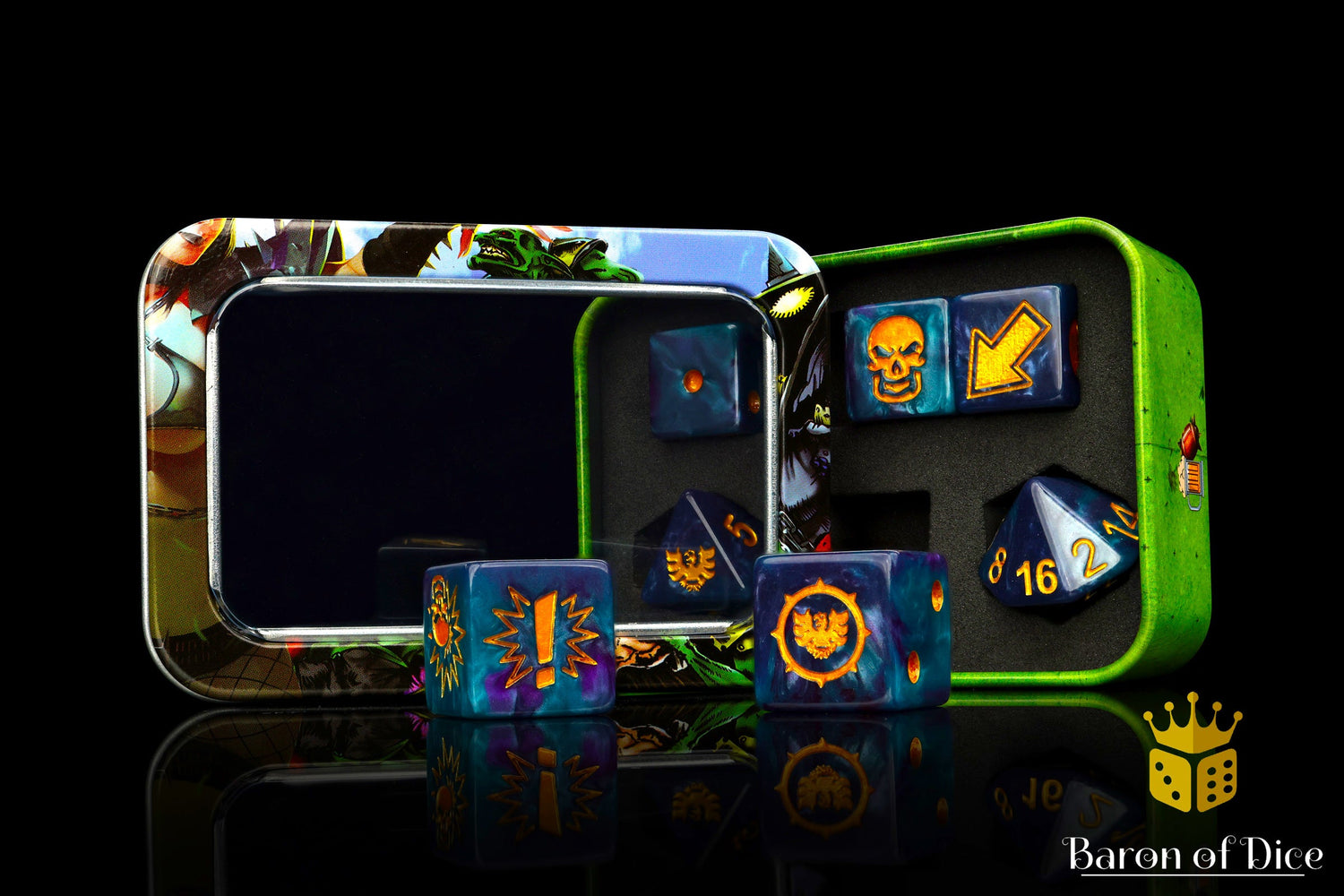 Our premium hand swirled resin dice contain stunning turquoise swirled with rich purples and inlaid with a metallic gold. All symbols are on the 6, 8, and 16 sides, please choose a design to complement your army!