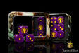 Our premium hand swirled resin dice contain a light purple base swirled with dark purple swirls and inlaid with a bright yellow. All symbols are on the 6 side.