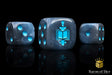 These contain a mix of smokey greys swirled with a darker blue-steel hues and inlaid with bright ice blue; resin 16mm dice. The symbols are on the 6 side. These come in round corner, square corner or 12mm mini; choose wisely! Our premium dice now come in a unique reusable tin!