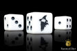 These contain a base of matte finish white and inlaid with a magical dark grey combination; resin 16mm dice. Matte finish. The symbols are on the 6 side. These are square dice. Our premium dice now come in a unique reusable tin when purchased in x25 and x50 count.