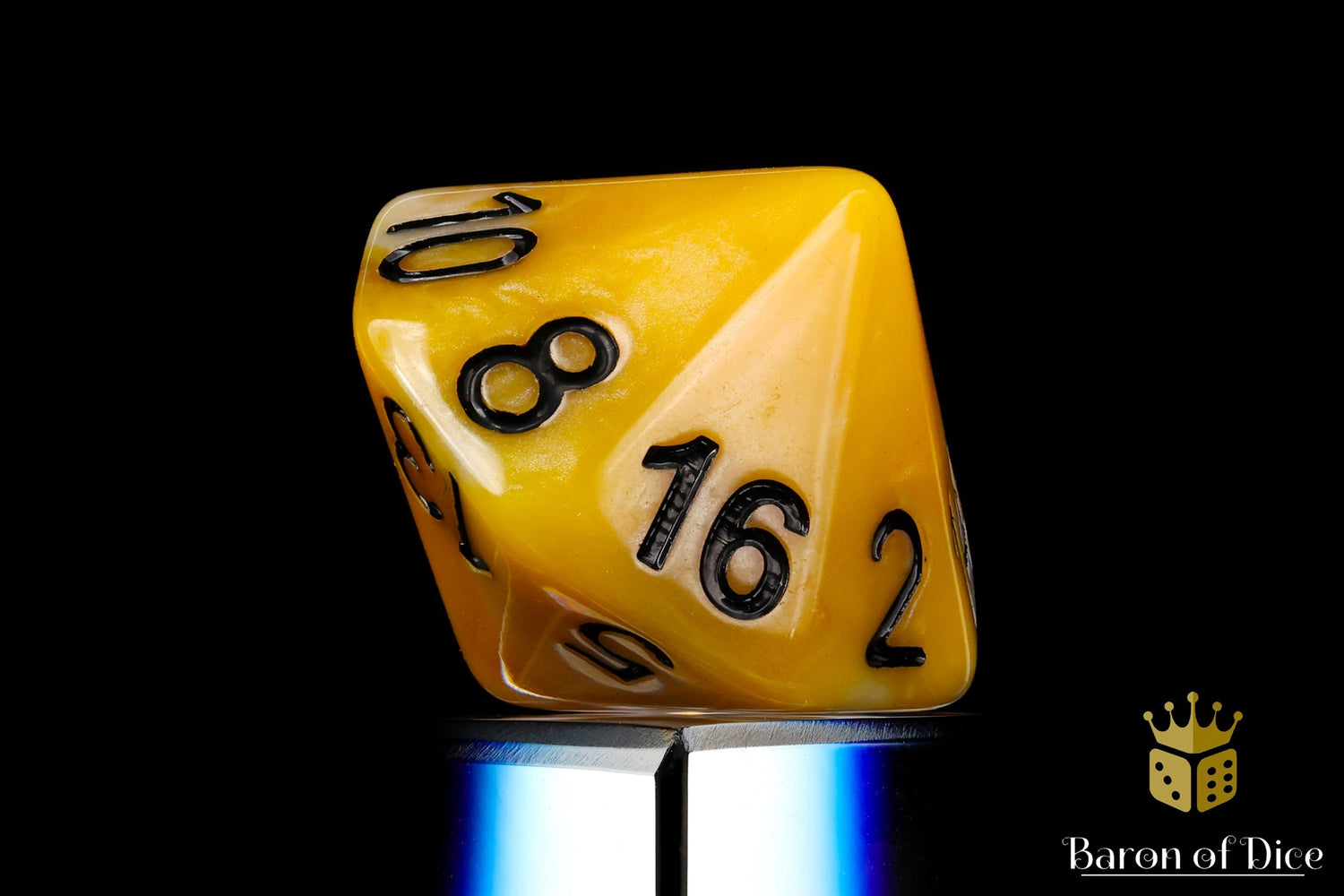 Keeping track of wounds, command points, or victory points with a D6? Time to upgrade! Sold by the single count or a pack of 5. Choose from over 12 different color schemes, with more colors being added quarterly! Each die is hand mixed resin 16mm, D16 dice. Numbers 1-16 are shown.