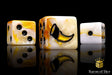 These contain a base of defiant whites swirled with a veins of true gold shimmer and inlaid with a two toned, regal black and bright yellow symbol; resin 16mm dice.  The symbols are on the 6 side. These are square dice. Our premium dice now come in a unique reusable tin when purchased in x25 and x50 count.