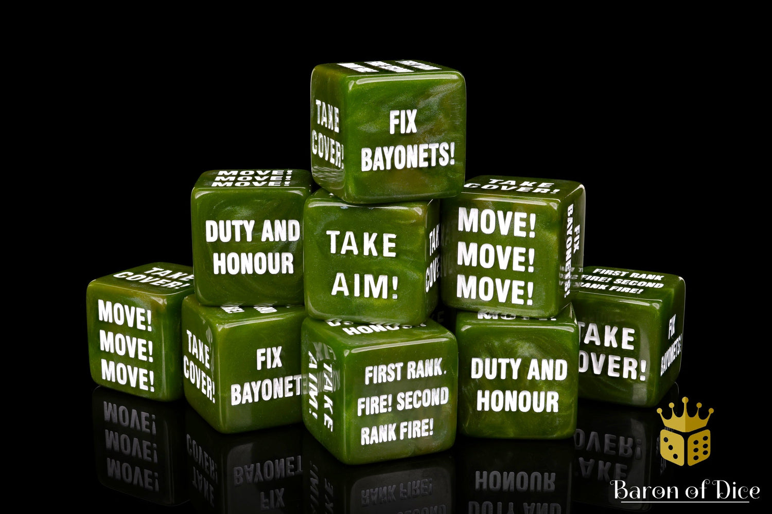This dice set features a combination of dice to fill Imperial Guard's Regimental Order rolls! Featuring a camouflaged green swirl with pure white inlay for readability. Please choose either x10 or x25 count. These come in a unique reusable tin when purchased in x25 count.