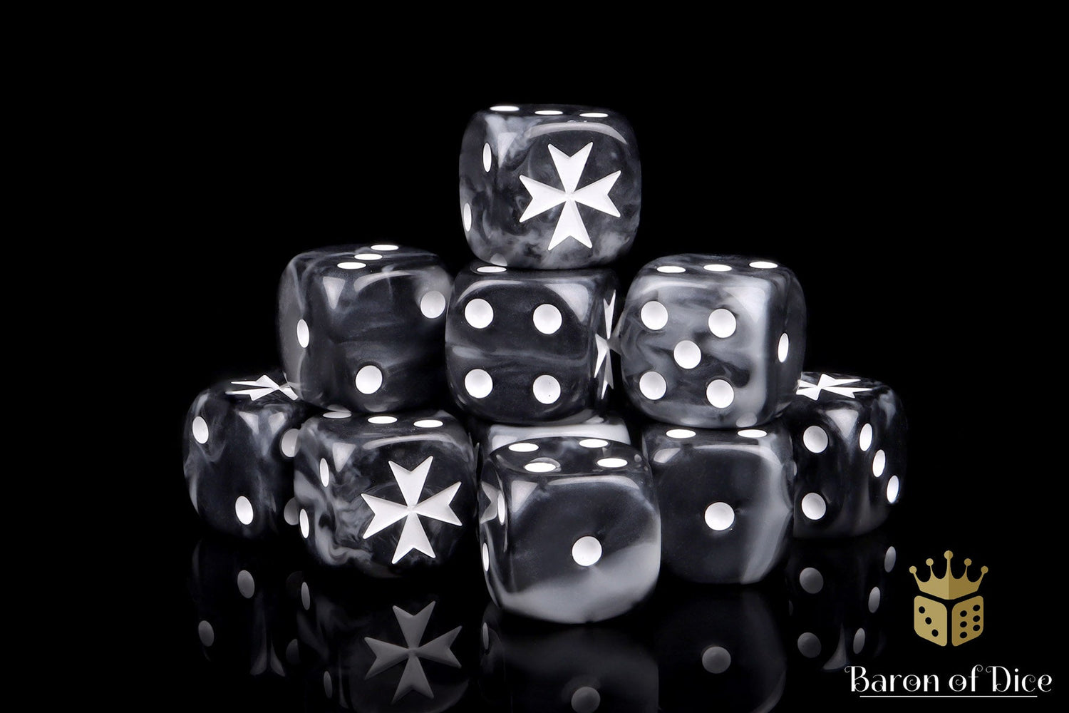 These contain a mix of gallant greys swirled with veins of faultless whites and inlaid with a honest white; resin matte 16mm dice. The symbols are on the 6 side. These dice are matte finish. Our dice come in round corner or square corner or 12mm, mini; choose wisely! Our premium dice now come in a unique reusable tin.