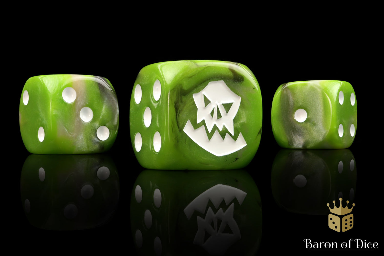 These contain a mixture of with hulkin' Orc greens swirled with bits of rocky greys and veins of black and inlaid with pure white; resin 16mm dice. The symbols are on the 6 side. These dice have an option of round corner, square corner or 12mm mini size, choose wisely! Our premium dice now come in a unique reusable metal tin.