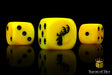 These contain a mix of defiant yellows swirled with headstrong yellow hues and inlaid with a defiant black; resin 16mm dice. The symbols are on the 6 side. Our premium dice come in a unique reusable tin.