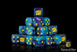 These contain a mix of celestial purples swirled with galactic turquoise colors and inlaid with rich yellow; resin 16mm dice. The symbols are on the 6 side. These dice have an option of round corner, square corner or 12mm mini; choose wisely! Our premium dice come in a unique reusable metal tin.