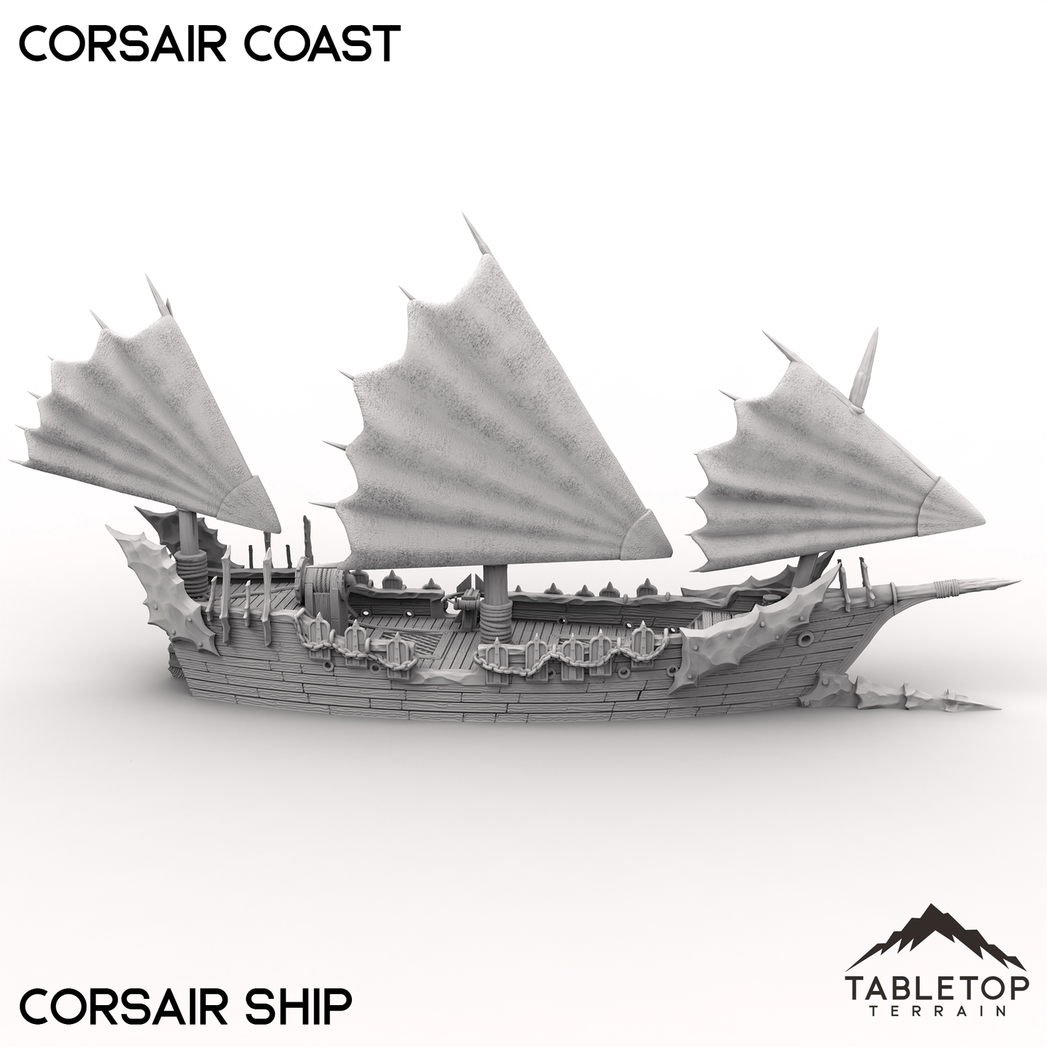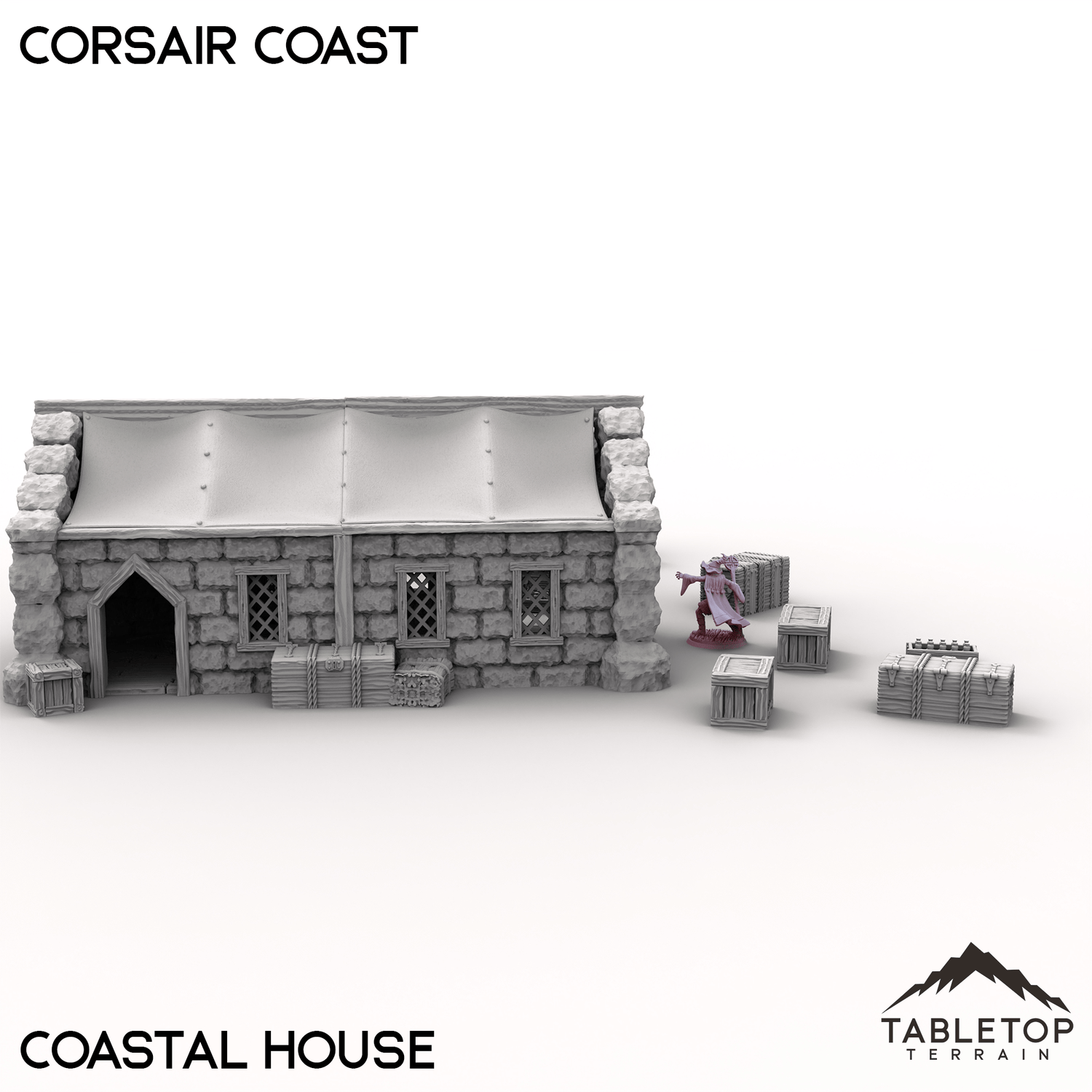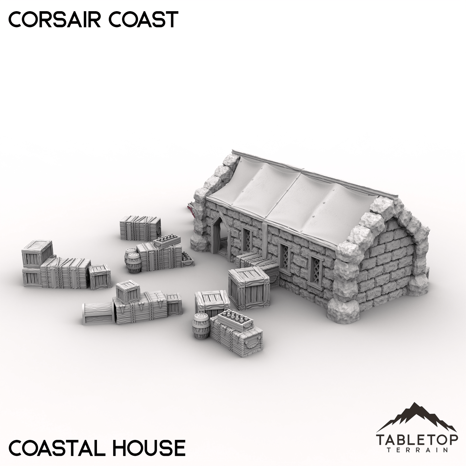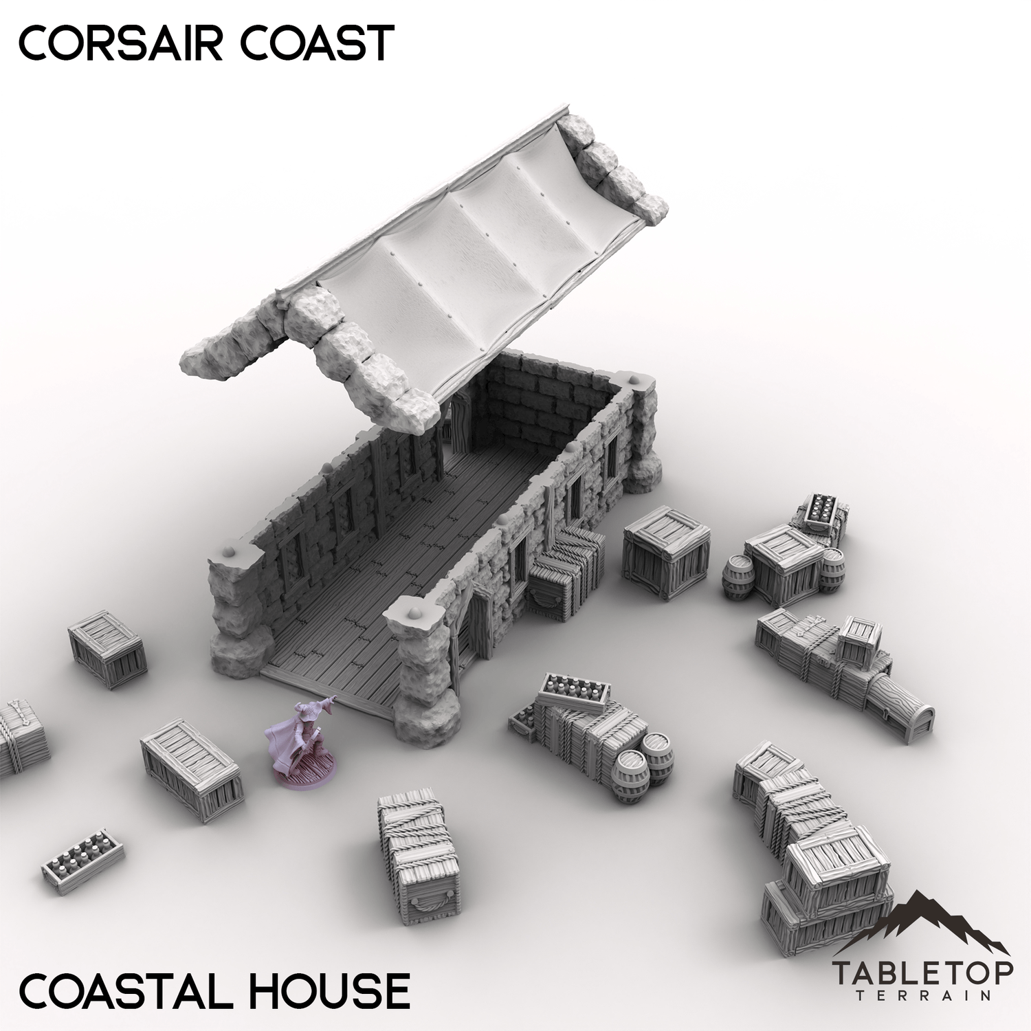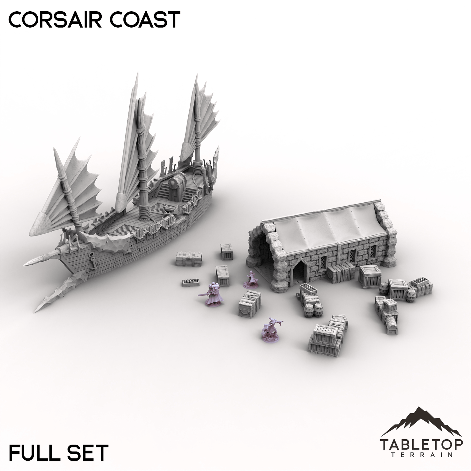 The Corsair Coast collection is a set of a Corsair Ship and a Coastal House. The ship is highly detailed, a sturdy design, and includes a removable ballista. The Coastal House is a fairly simple but functional design for storing cargo along the ship's route, and comes with a collection of boxes as scatter terrain.