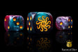 These are ever-changing rich magenta swirled with bright teals and muted purples and inlaid with a metallic gold; hand-mixed resin 16mm dice.  The symbols are on the 6 side. These dice come in round corner, square corner or 12mm mini; choose wisely! Our premium dice come in unique reusable tins.