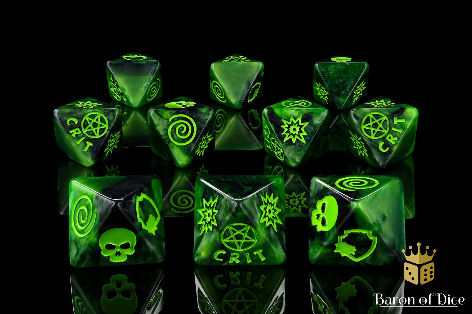 Ready for the Dark Reign? These contain a pure black swirled with unnerving green veins and inlaid with a bright green. The symbols are all unique with a focus on a singular critical die face differentiating the designs. Each set comes with x10 count, D8 dice encased inside an exclusive metal tin.