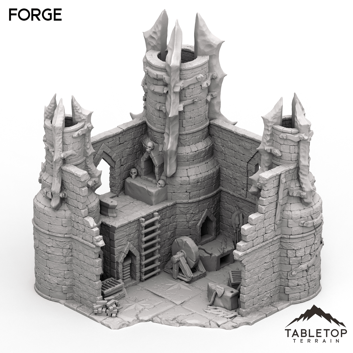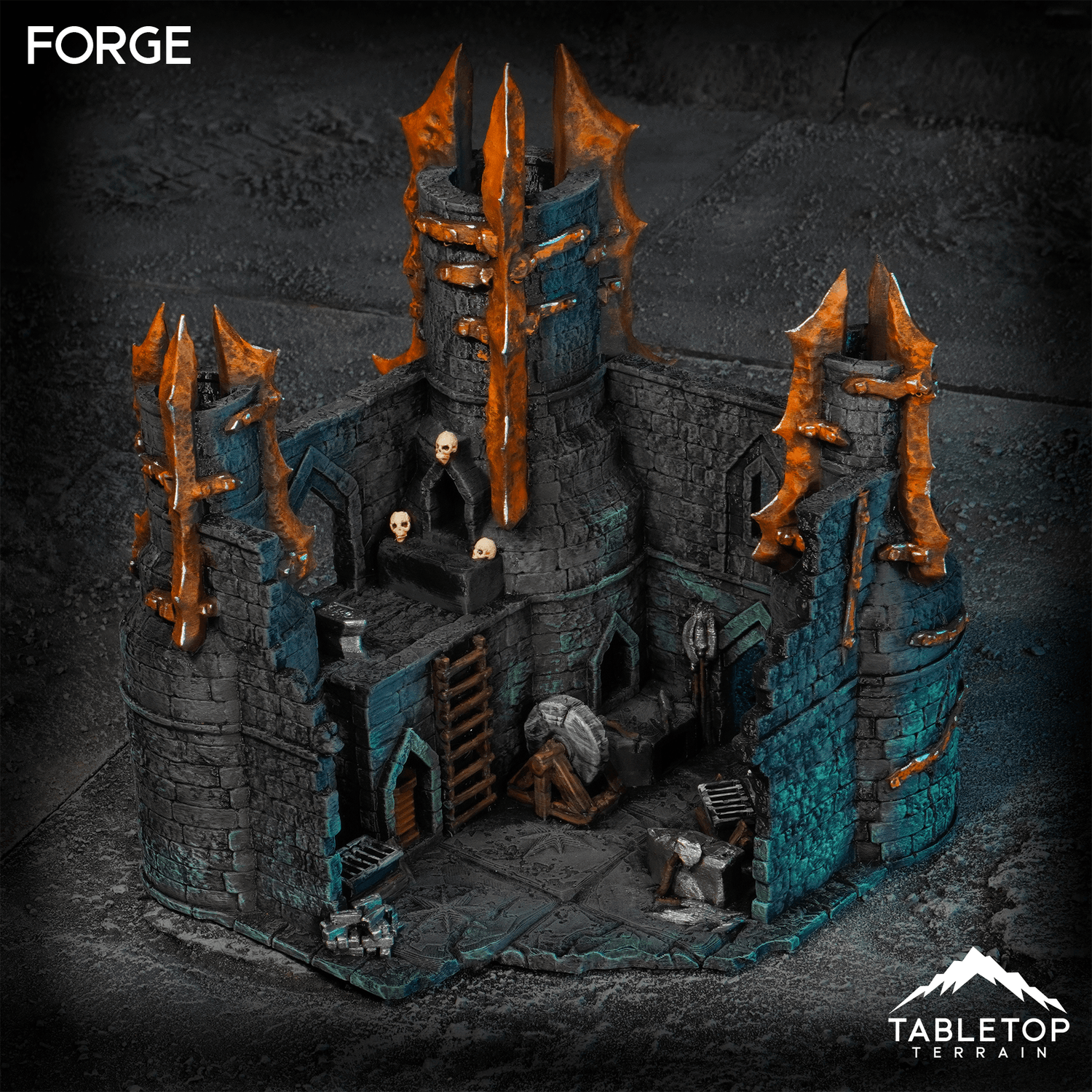The Forge set is a open-face building, the workshop of a smith and detailed with the tools of their trade. 3 towers jut forth from the walls as smokestacks for the furnaces, and a small window overlooks the surrounding area beyond. The Forge is designed for fantasy tabletop games, but can be sued with any genre.