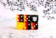 These are hand mixed layered resin dice, combining three colors layered like the flag. Featuring a vivid yellow, patriotic red, and deep black and inlaid with a clear white; resin 16mm rounded edge dice. The symbols are on the 6 side.