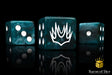 These contain a base of dark greenish-blues with swirled with black dye and inlaid with a pure white; resin 16mm dice. The symbols are on the 6 side. These are square dice. Our premium dice now come in a unique reusable tin when purchased in x25 and x50 count.
