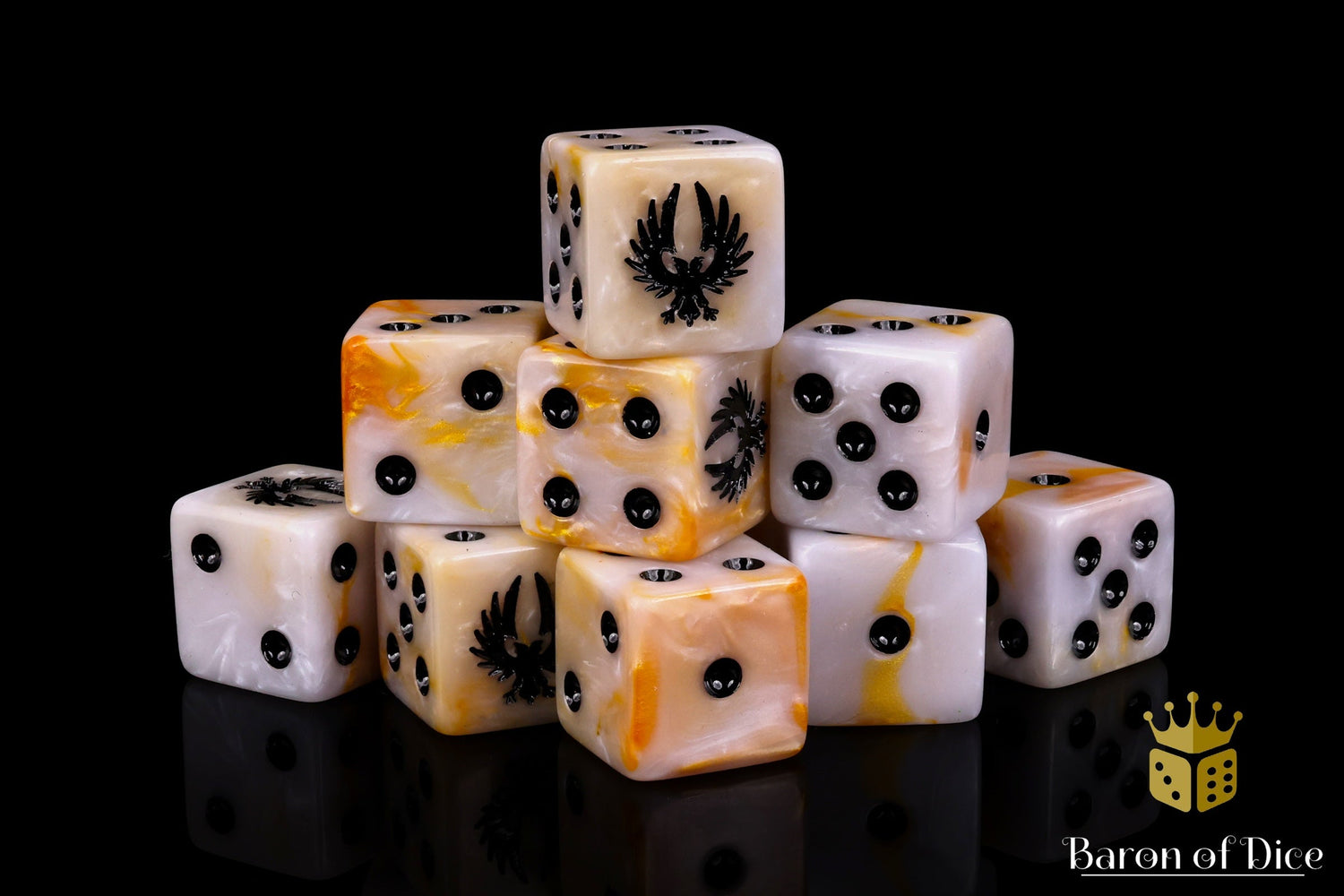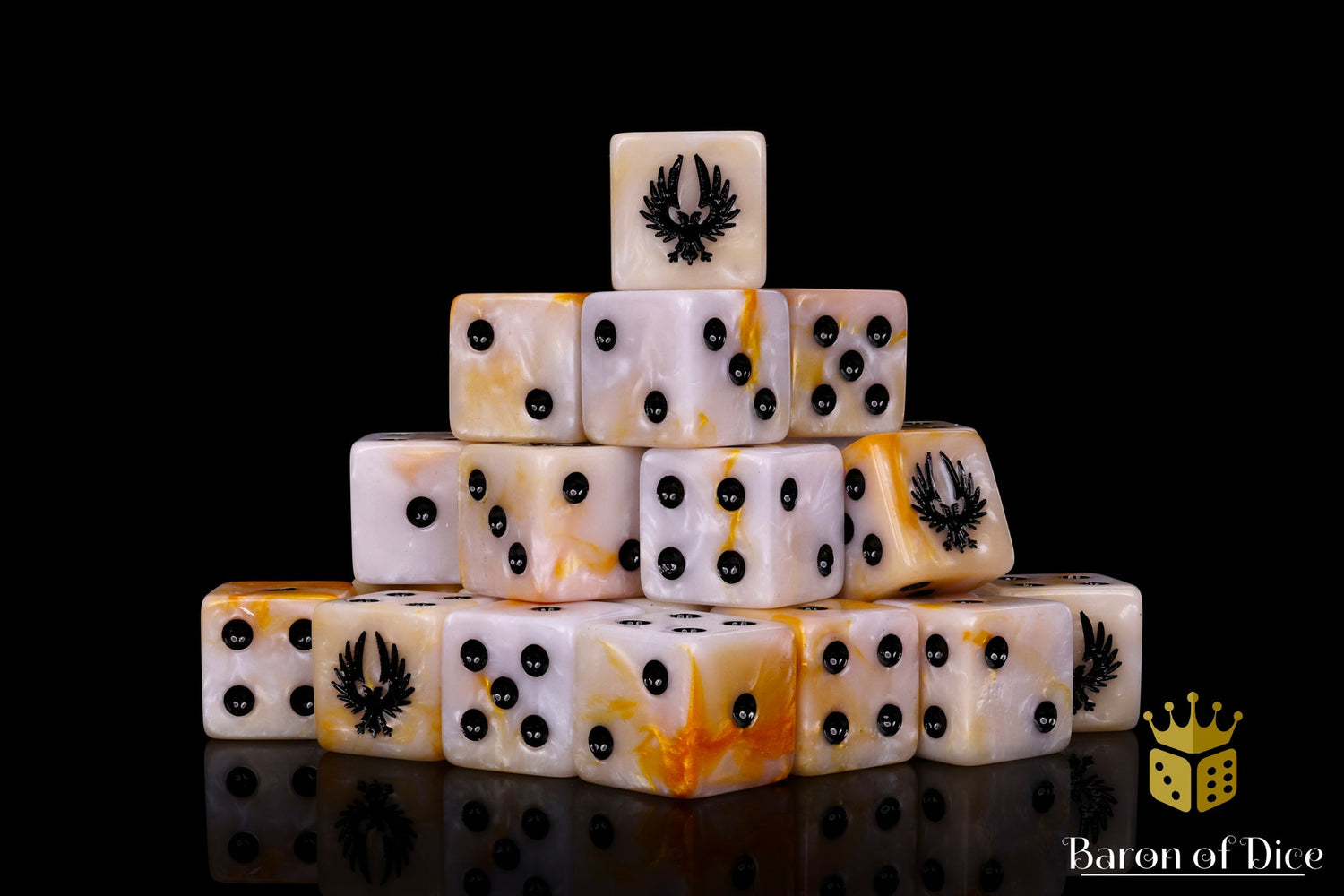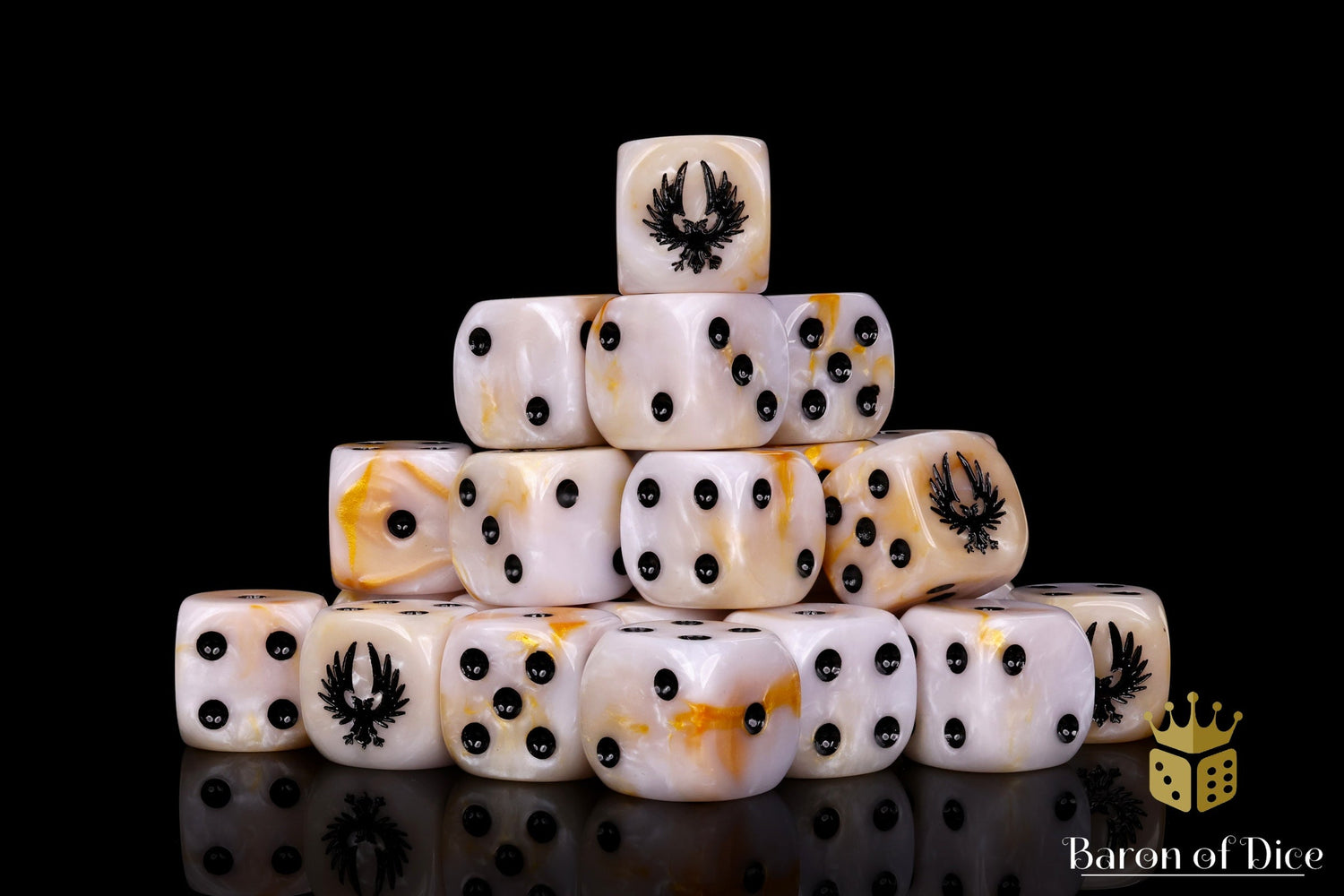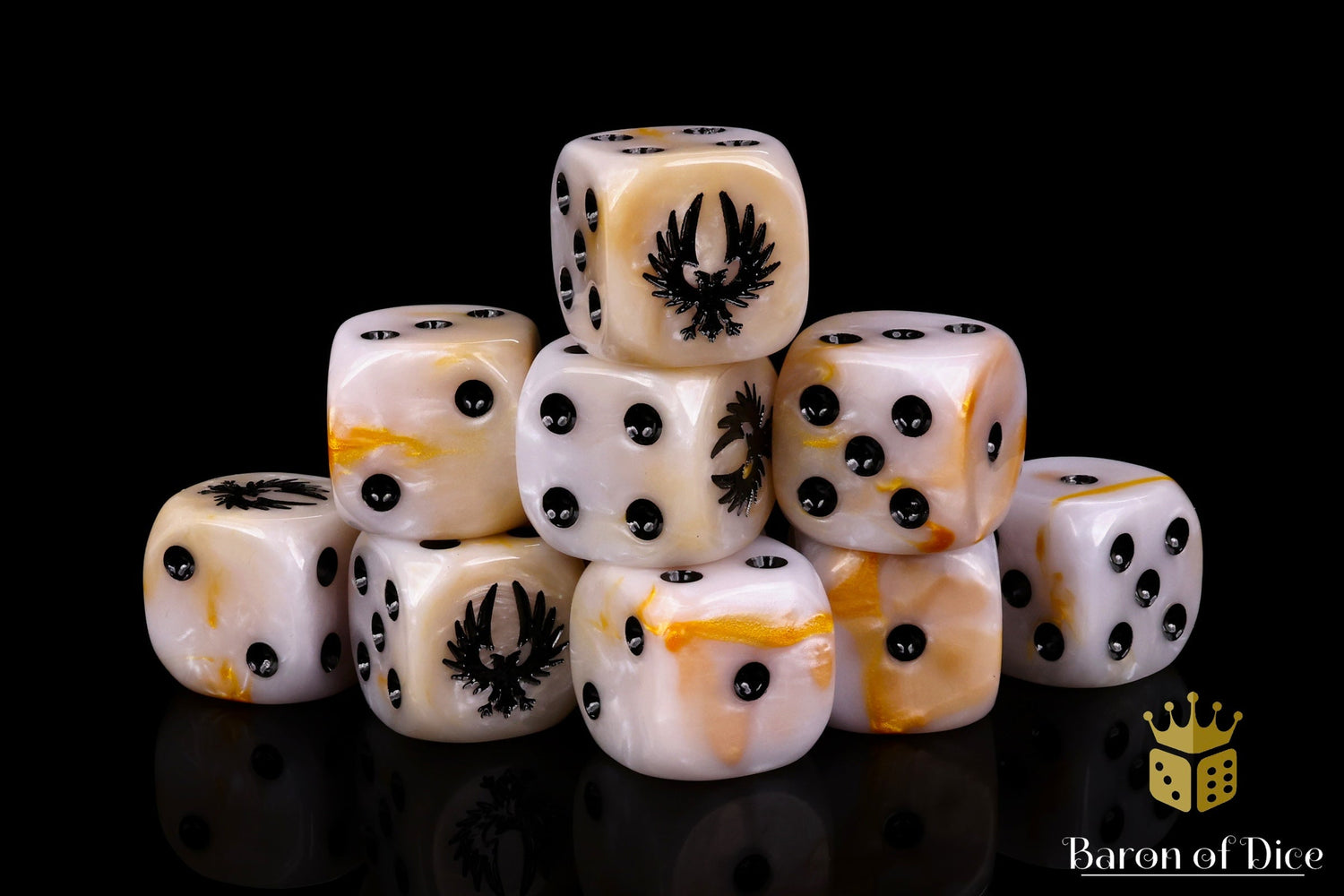 These contain a mix of marbled whites and swirled with gold flakes and inlaid with a pure black; resin 16mm dice. The symbols are on the 6 side. Our premium dice now come in unique reusable tins.