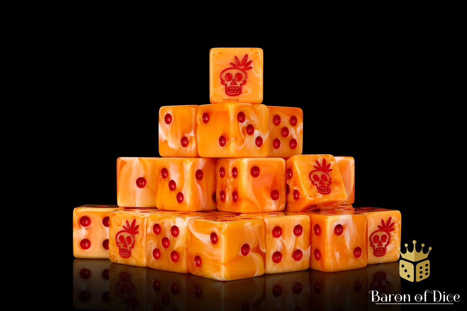 These are officially licensed, Mythic Earth dice, finally! Hand-mixed resin, featuring a base of fiery oranges swirled with veins of white and inlaid with a bloody red; 16mm dice. The symbols are on the 6 side. Our premium dice come with unique reusable tins.