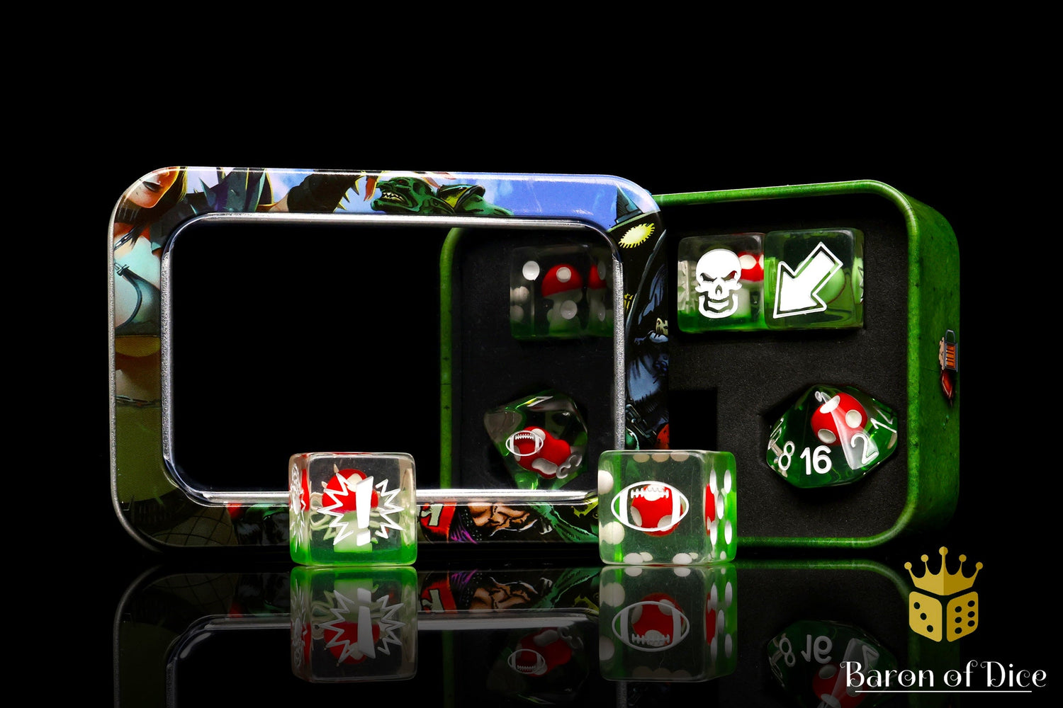 Our premium hand swirled resin dice contain a crystal clear base with green grass and a resin casted mushroom encased within and inlaid with a crisp white. All symbols are on the 6, 8, and 16 sides, please choose a design to complement your army!