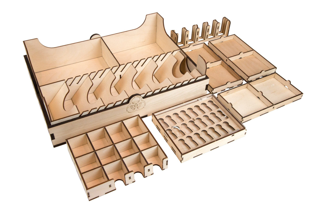 This premium storage solution organizes Pandemic and all of its expansions in one easy to transport unit. Six removable trays help you get to finding the cure sooner. The pawn tray keeps all the player pieces separated and easy to get to the specific piece you need. Three identical trays neatly hold the disease cubes. The vaccine vial tray holds the vials that come with the “In the Lab” expansion for ease of play. Includes 6 adjustable dividers.