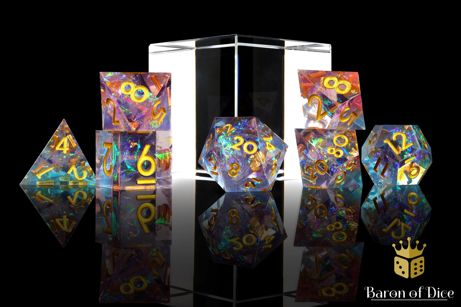 This set is for the glamorous, the fashionable vampire aristocrat at a lavish ball, the royal elven lord at the ceremony. Within each die, contains a glittering pink and teal explosion. The dice are hand polished sharp corners, unique amongst our collection. They are a crystal clear translucent swirled with a pink and teal hues and reflective silver glitter and inlaid with a metallic gold; premium hand-mixed resin 16mm dice set containing D4, D6, D8, D10, D10, D12, and D20.