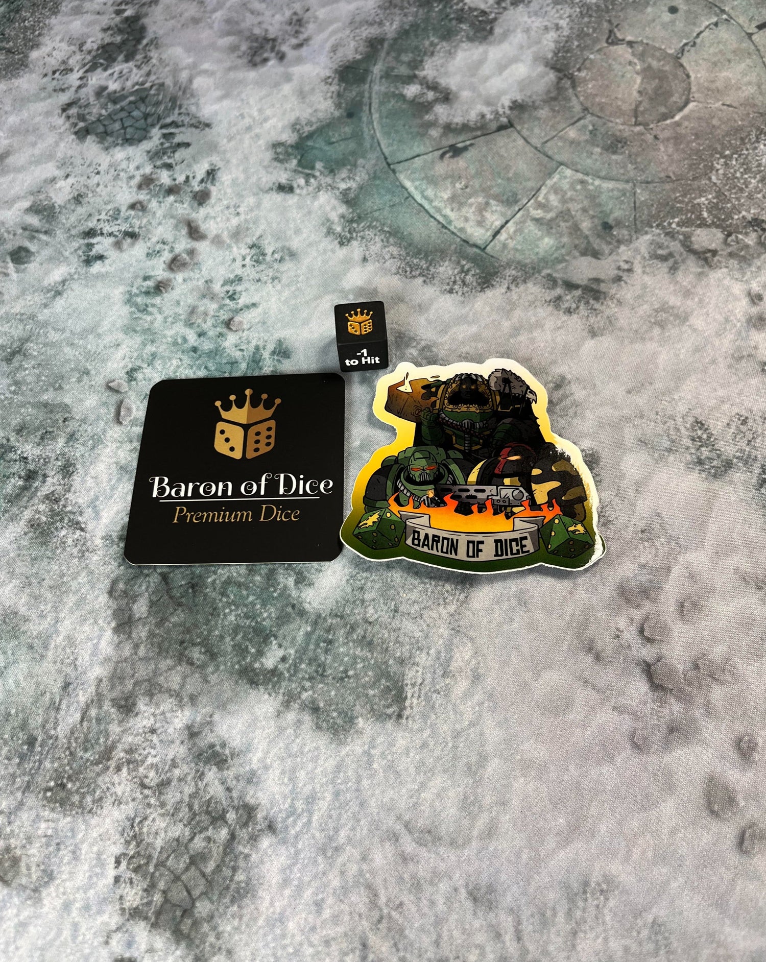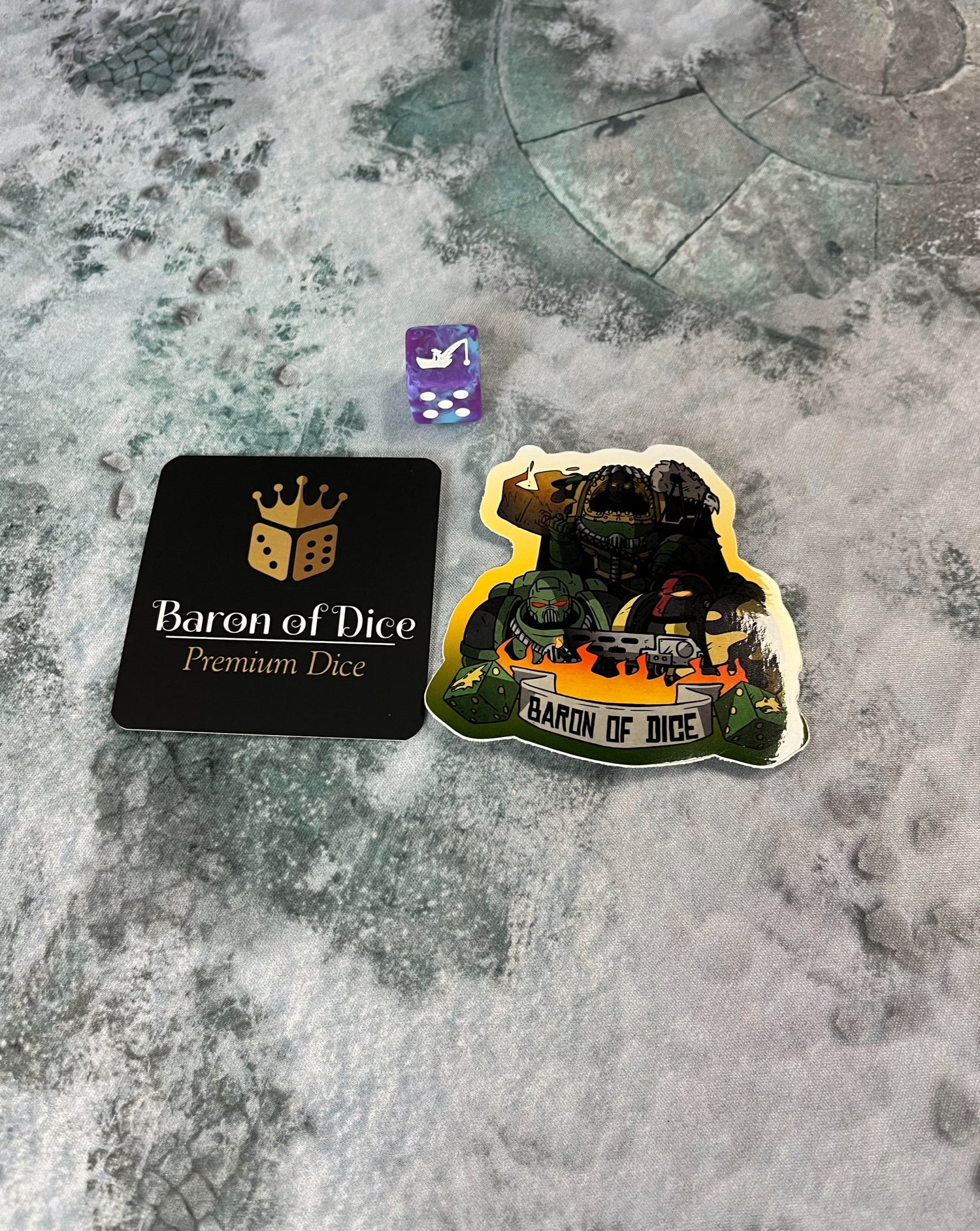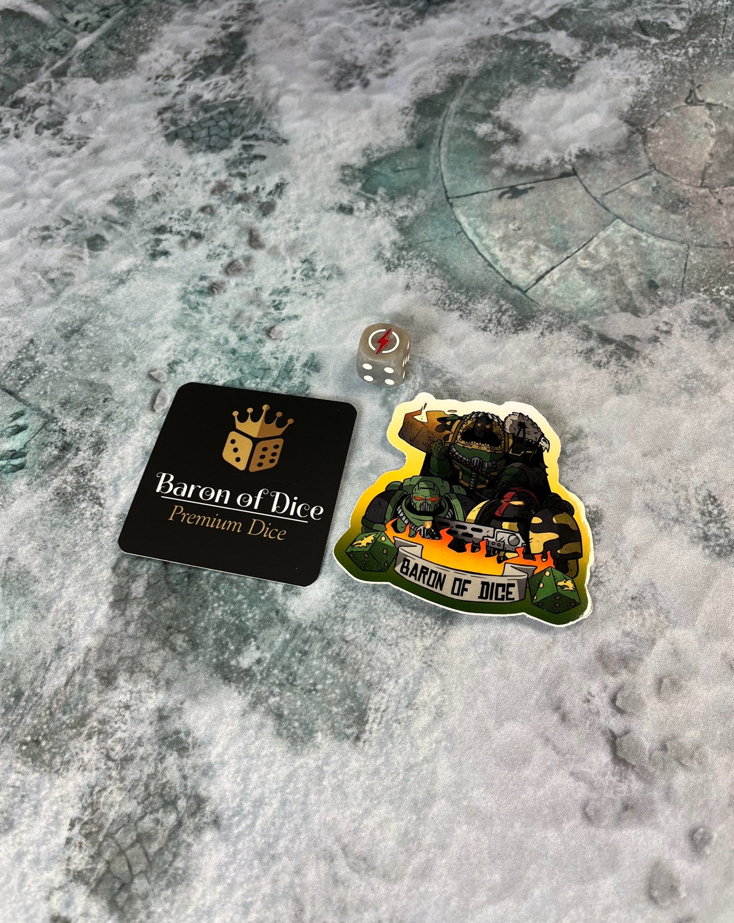 Each swag bag has a random game system compatible die, premium sticker (also compatible to the game system selected) and Baron Biz card, typically TO's order enough for each player to receive a bag. Enhance your event!