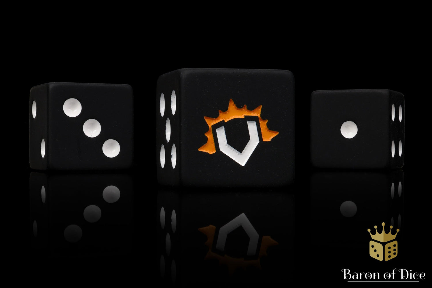 Featuring a base of legendary black and inlaid in a two toned white and valiant orange-yellow; resin 16mm dice. These are Matte finish dice. The symbols are on the 6 side.