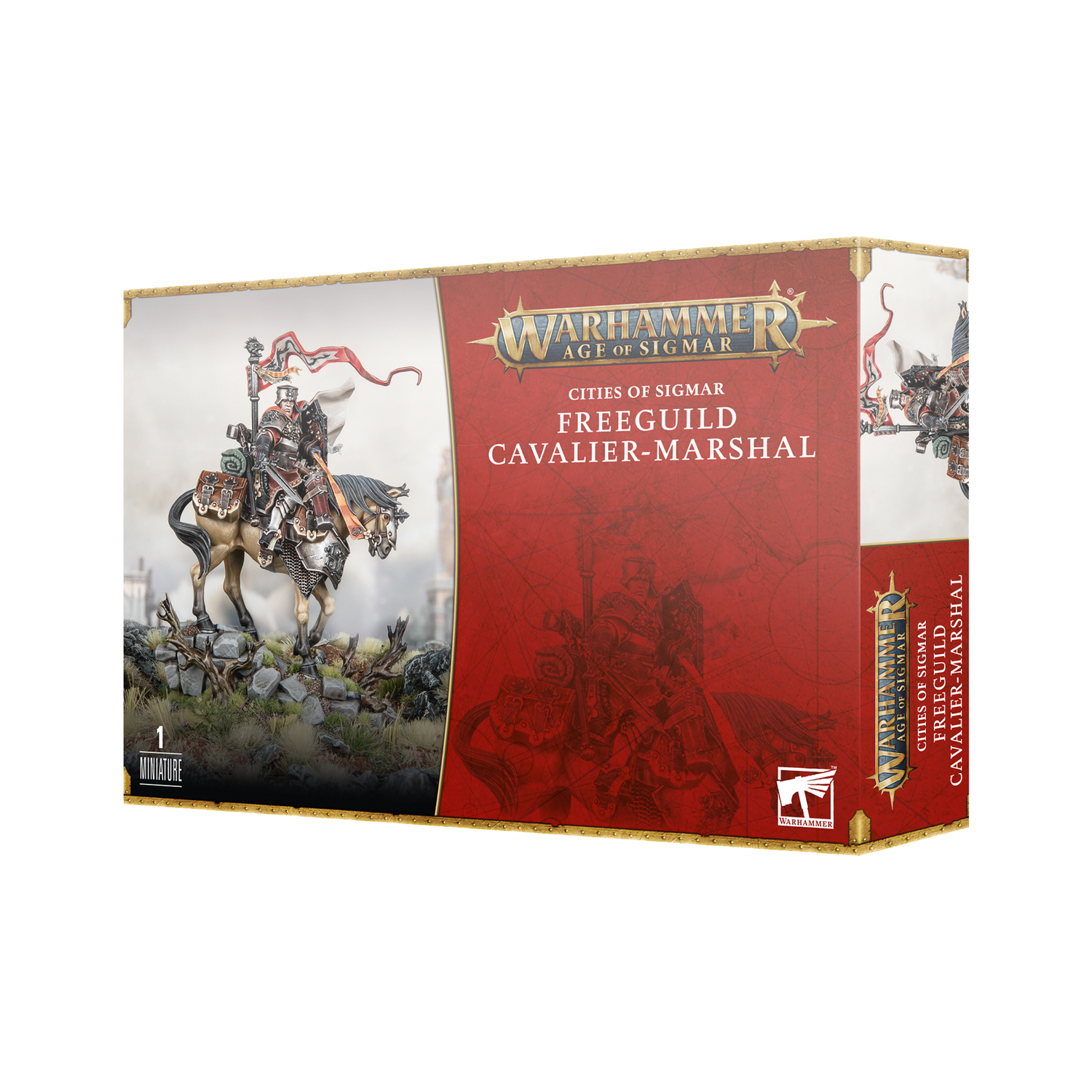 This multipart plastic kit builds a Freeguild Cavalier-Marshal, a knightly leader mounted on a sturdy warhorse. The Cavalier-Marshal cuts a dramatic figure in finely detailed plate armour, wielding a master-forged longsword with cape and pennant billowing in the wind. Their powerful warhorse is similarly armoured, and carries packs of supplies and spare weapons for a long campaign – including a holstered dragoon pistol.