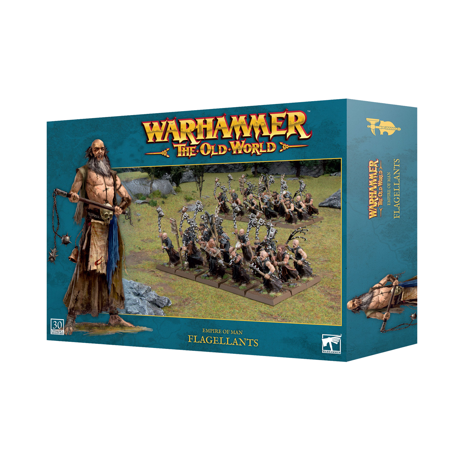 This multipart plastic kit builds 30 Flagellants for use in Empire of Man armies in games of Warhammer: The Old World. These can be fielded as one huge mob of 30, or two smaller groups of 15, each with an optional Champion and standard bearer to goad these zealots into fits of fury. The arms and heads in the kit are interchangeable across the miniatures, and a wealth of accessories and weapon options makes it easy to customise your units.