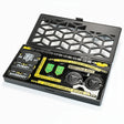 The Battle Box features a glossy black finish with engraved components for durability and a clean, premium look on the table. The custom storage case includes dedicated slots for every component, keeping everything organized and protected, while the secure clasp system ensures the box stays closed during transport.