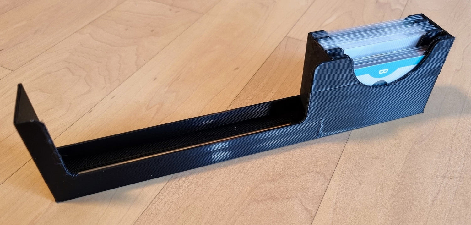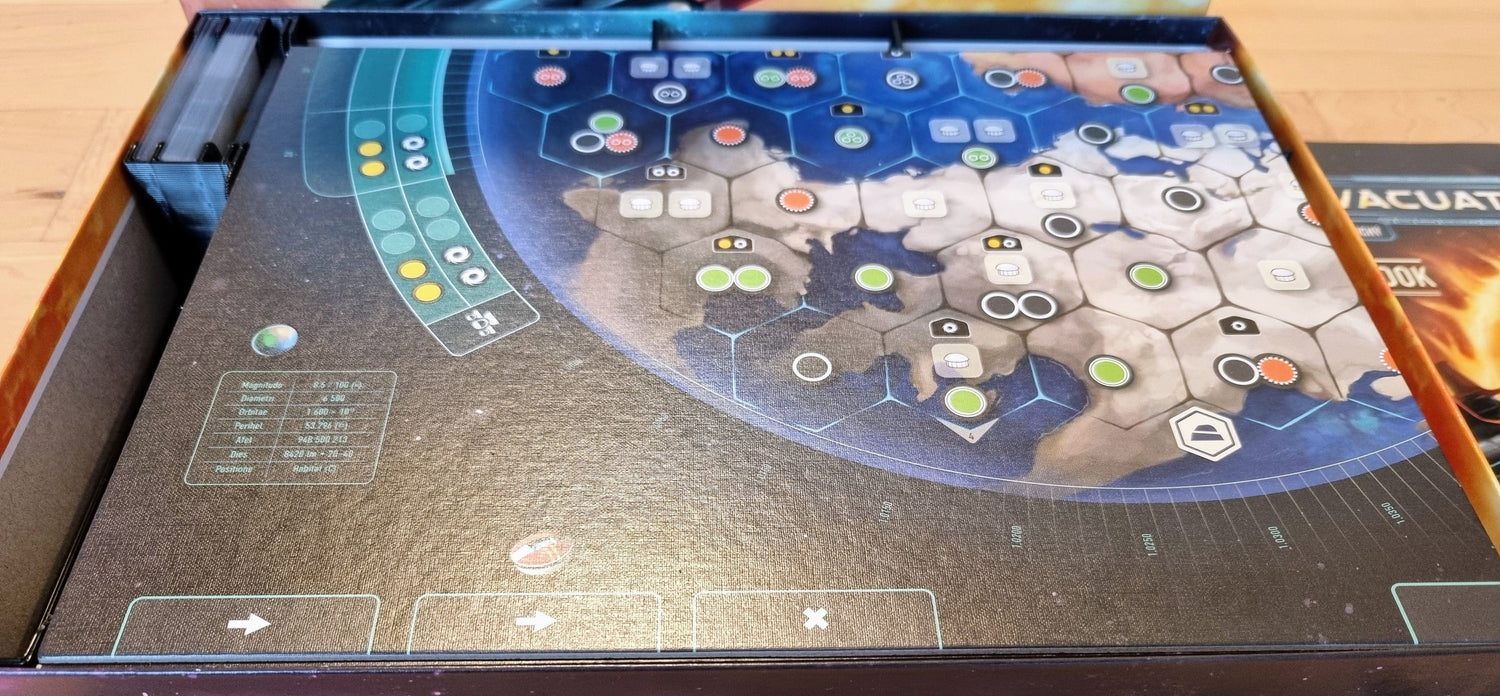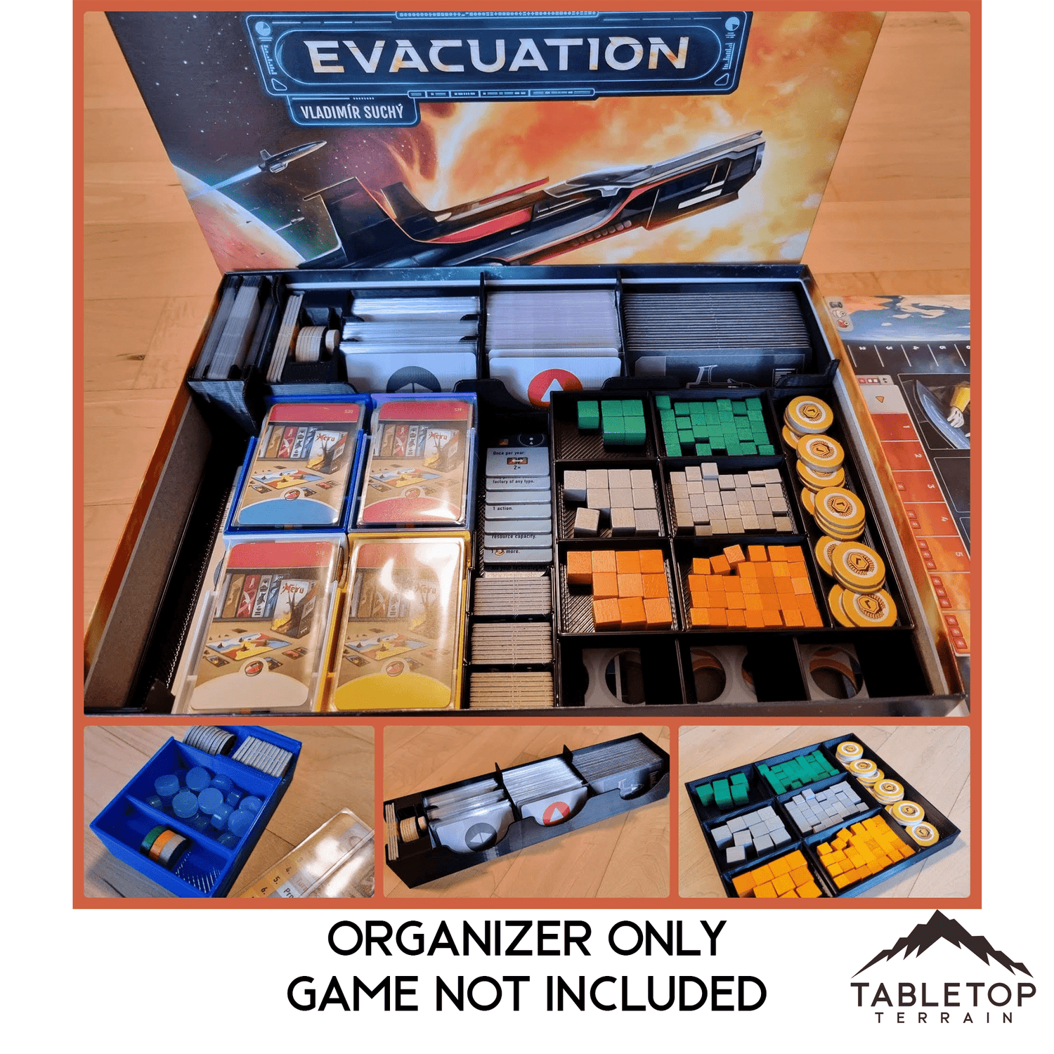 This is an organizer for the board game Evacuation. It supports sleeved cards and vertical storage if you leave the punchboards underneath there is a spacer (included) that goes at the bottom of the box that fills up some of the empty space otherwise left in the box.