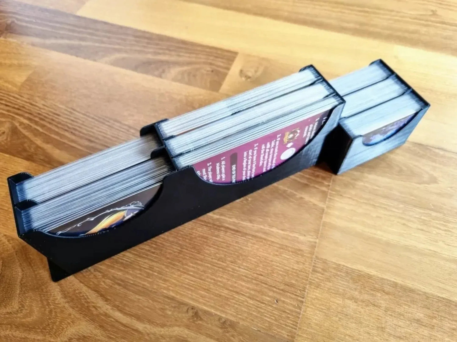 It supports sleeved cards, vertical storage an "sleeved" chips (coin capsules)