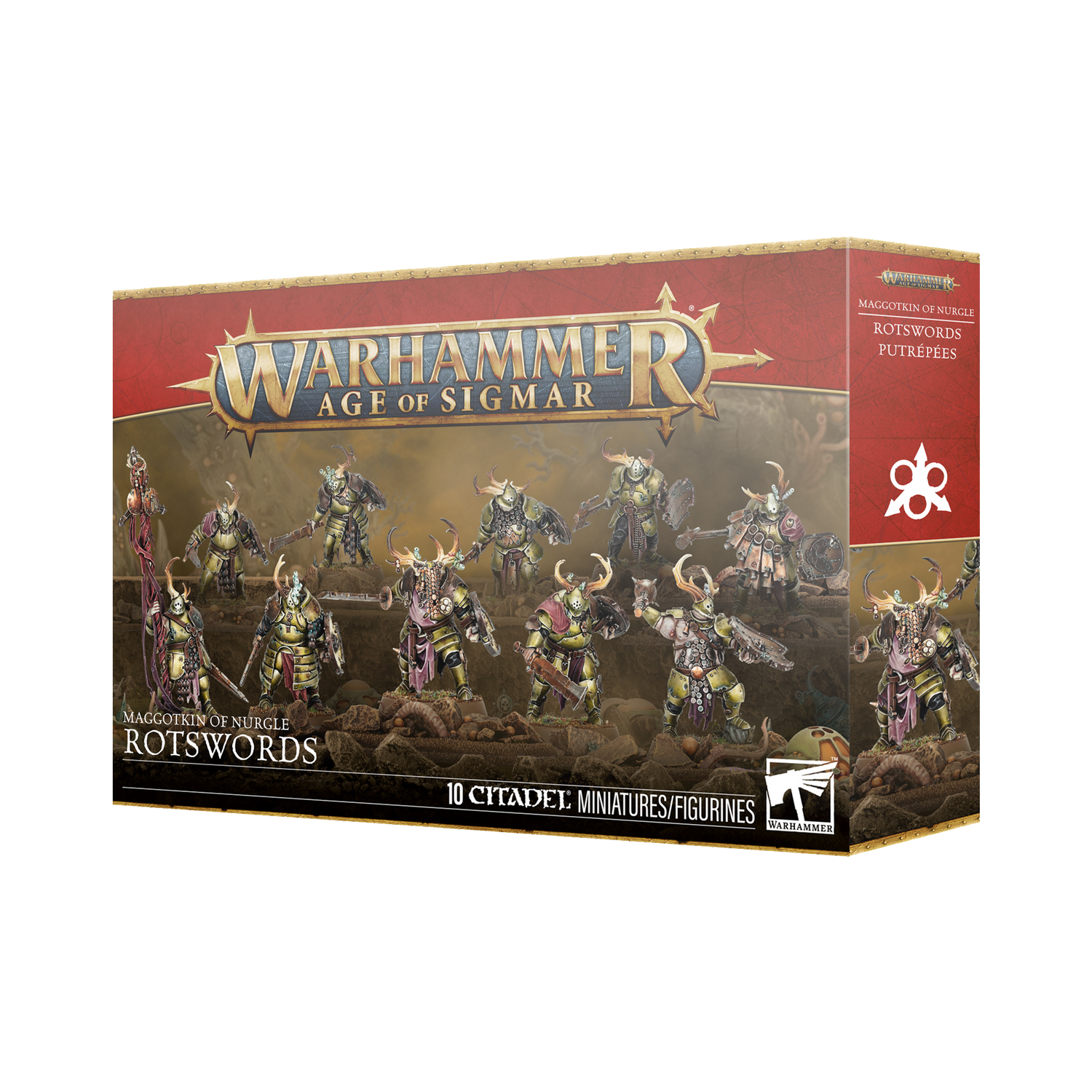 This multipart plastic kit builds 10 Rotswords for Maggotkin of Nurgle armies in Warhammer Age of Sigmar. Designed for durability and board control, Rotswords excel at holding objectives, shrugging off damage behind rusted armor while carving into foes in close combat. Each model can be armed with dual weapons or a weapon and shield, with interchangeable heads, weapons, and shields for easy customization. The kit also includes options for an optional champion, musician, and standard bearer, with a choice of banner toppers.